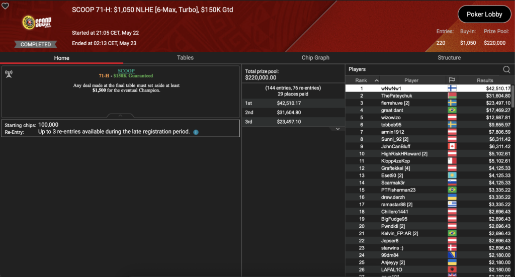 Das SCOOP 71-H: $1.050 NLHE 6-Max ($150k GTD) konnte insgesamt 220 Entries verzeichnen und somit gab es einen Preispool von $220.000. Der finnische Sieger ‚wNwNw1‚ konnte $42.510 mit nach Hause nehmen.