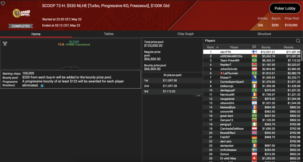 Auch im SCOOP 72-H: $530 NLHE PKO ($100k GTD) siegte ein Finne. Das Turnier sammelte 266 Entries und somit wurde ein $133.00 Preispool auf 34 Plätze verteilt. Der Großteil von $11.097 plus $12.031 ging an ‚olle1FIN‚.