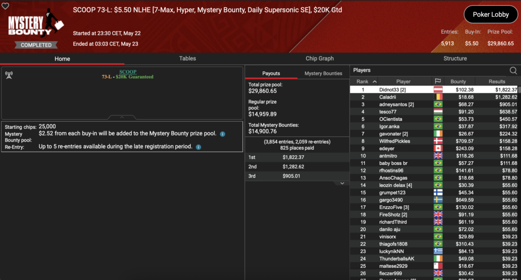 Im SCOOP 73-L: $5.30 NLHE Mystery Bounty ($20k GTD) hatten wir einen DACH-Sieg! 5.913 Entries bedeuteten einen $29.860 Preispool. 825 Spieler erhielten einen Anteil daran und der Großteil ging an ‚Didnot33‚ aus Österreich. Dieser konnte $1.822 plus $102 an Bounties verbuchen.
