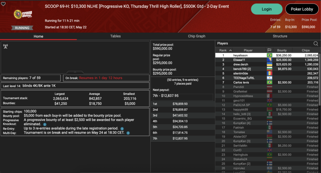 Und das größte Turnier des gestrigen Spieltages war das SCOOP 69-H: $10.300 NLHE Thursday Thrill High Roller ($500k GTD). 59 mal wurde das $10k Buy-in bezahlt und so kam es zu einem $590.000 Preispool. Für das Finale sind noch sieben Spieler übrig, darunter auch der in Bulgarien lebende deutsche Spieler Benjamin ‚bencb789‘ Rolle, der im Mittelfeld rangiert. Chipleader für den Moment ist allerdings der brasilianische Spieler ‚heyalisson‚. Der Top-Preis in diesem Event liegt bei 78.859 plus Bounties und momentan haben alle Spieler $12.837 sicher.