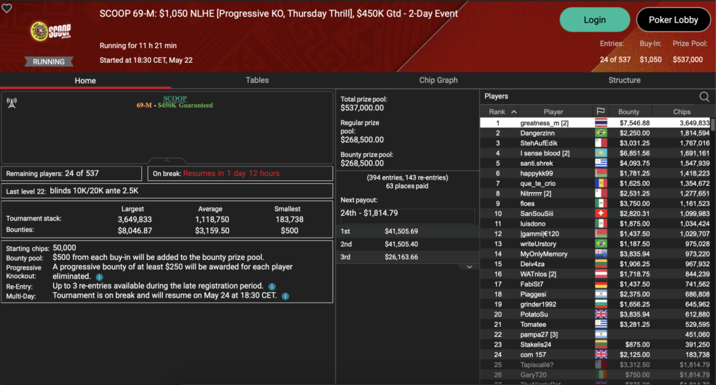 An der mittleren Variante, dem SCOOP 69-M: $1.050 NLHE Thursday Thrill ($450k GTD), nahmen 394 Spieler teil und bezahlten außerdem für 143 Re-entries. Dies ergab einen Preispool von $537.000, der auf die Top 63 Spieler verteil wurde. Für das heutige Finale verbleiben 24 Spieler und alle haben bisher $1.814 sicher. Der thailändische Spieler ‚greatness_m‘ hat momentan die beste Ausgangsposition für den Top-Preis von $41.505.