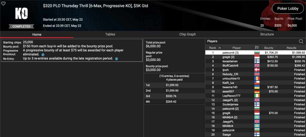 Fangen wir an mit dem $320 PLO Thursday Thrill ($5k GTD), das 20 Entries verzeichnen konnte. Vier 4-Karten-Liebhaber teilten somit einen $6.000 Preispool untereinander auf. Der Großteil von $1.099 plus $1.706 an Bounties ging an den Bulgaren ‚palecznik‚.
