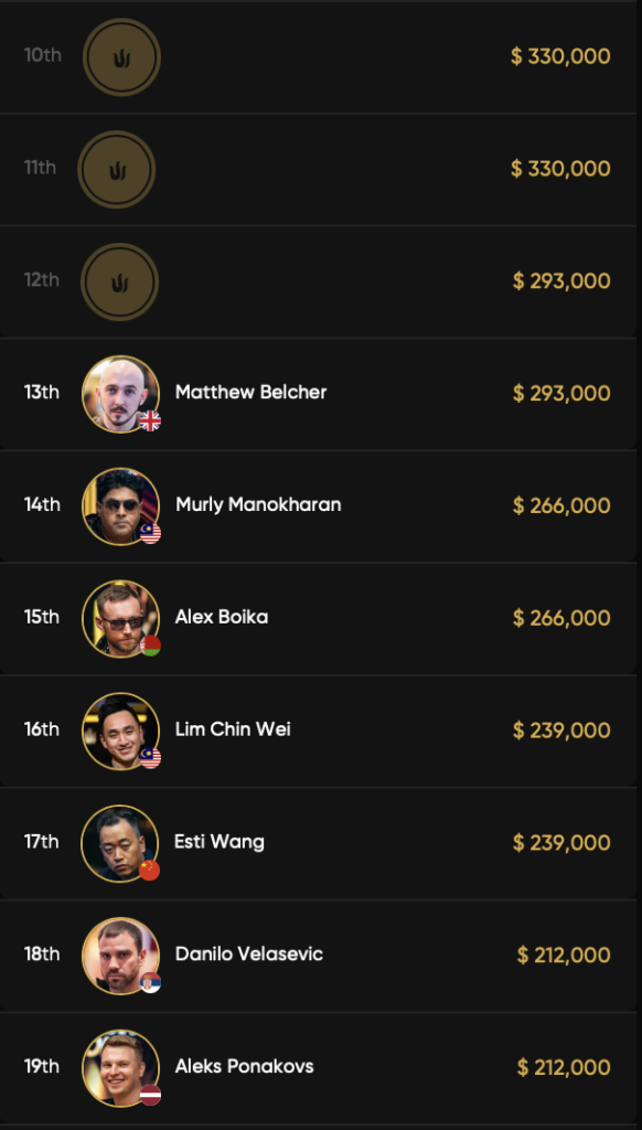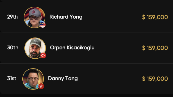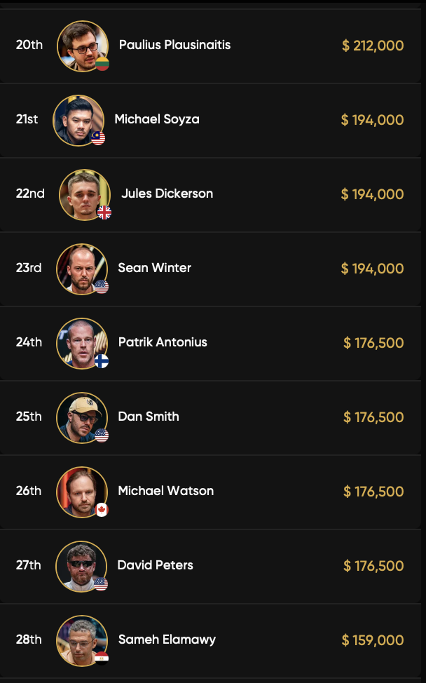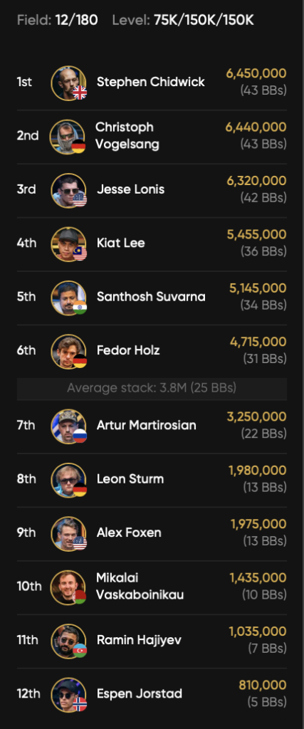 DACH-Spieler, die noch im Rennen sind, sind Leon Sturm auf Rang 8, Fedor Holz auf Rang 6 und Christoph Vogelsang auf Rang 2.