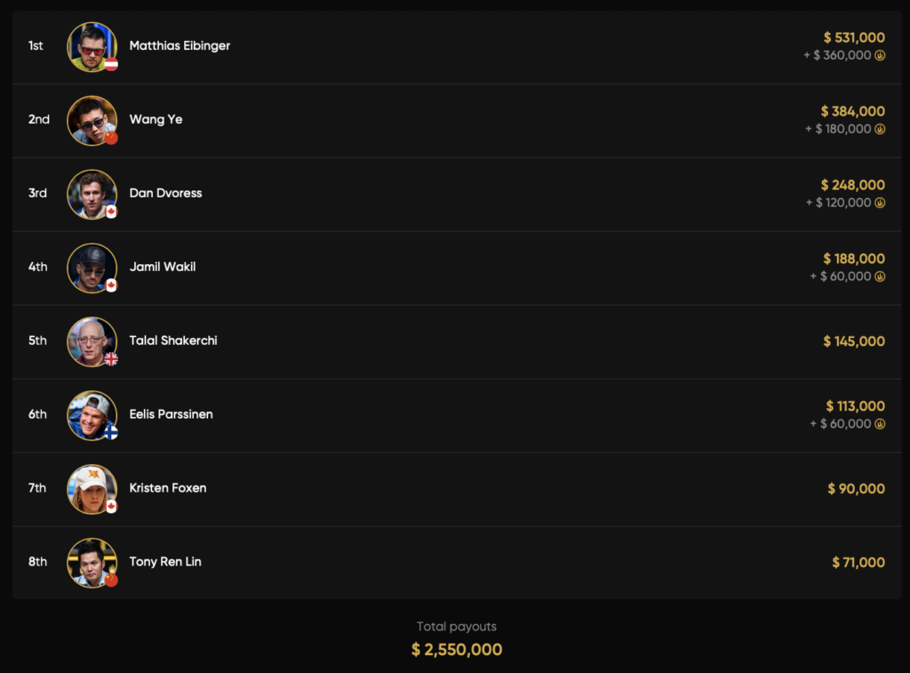 Eibinger hielt einen 64 zu 17 Chiplead und dies war auch genug, das Ding nach Hause zu fahren. Er konnte $891.000 plus $360.000 an Bounties mit nach Hause nehmen.