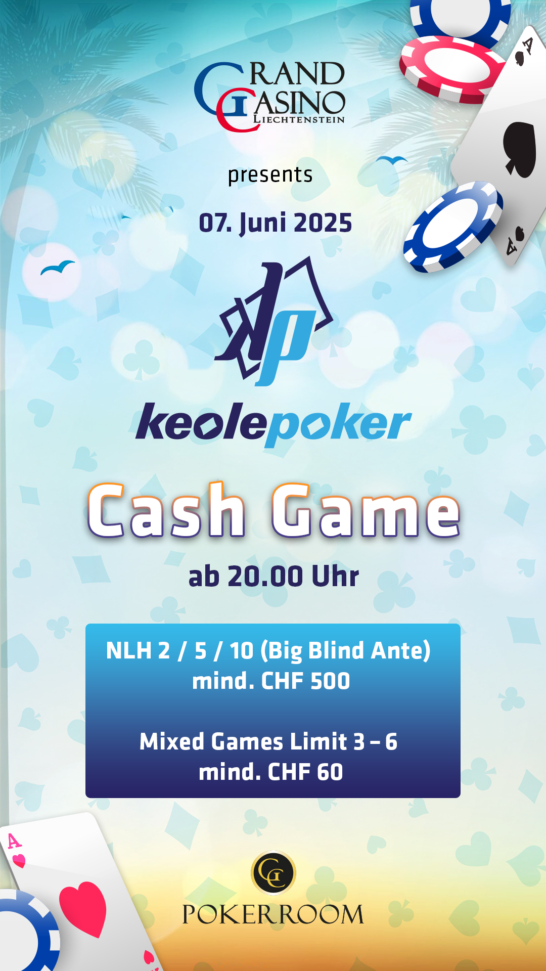Neben Turnieren werden täglich von 17:00 bis 04:00 Uhr auch Cash Games in den Varianten NLH, PLO, STUD, OFC für alle Limits angeboten, startend ab 1/3 (NLH) und 1/1 (PLO).