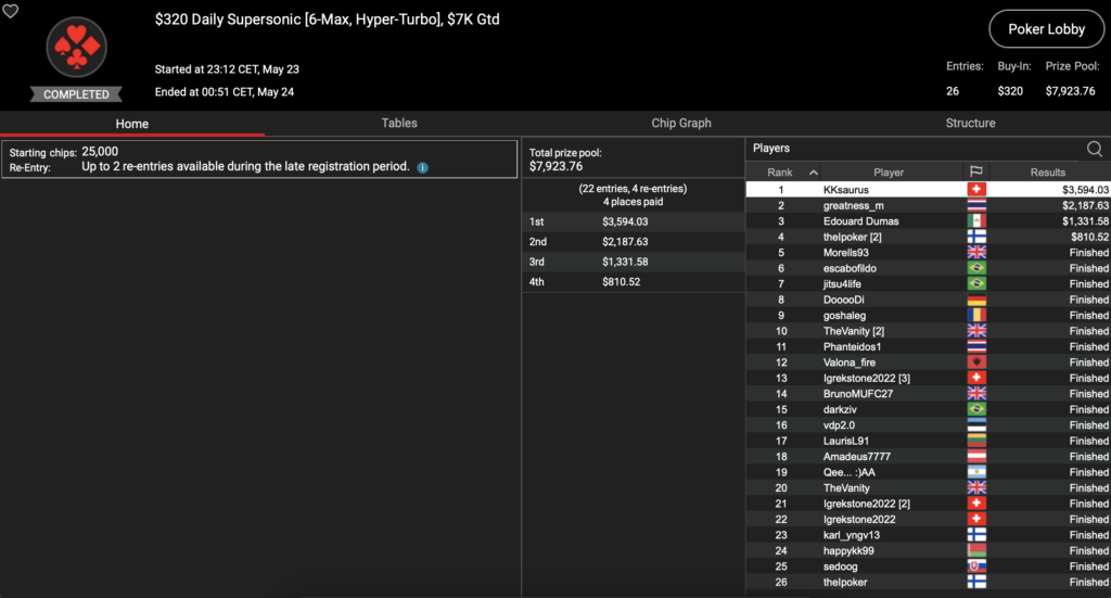 Unfassbar, aber wahr: Auch das $320 Daily Supersonic ($7k GTD) gewann ein Schweizer! Es gab insgesamt 26 Entries und somit einen Preispool von $7.923, der auf die Top 4 verteilt wurde. Der größte Anteil von $3.594 ging hier an ‚KKsaurus‚.