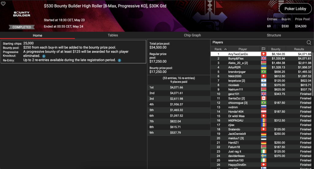 Das traditionelle $530 Bounty Builder High Roller ($30k GTD) war auch nicht vor den Schweizern sicher! 69 Entries schufen einen $34.500 Preispool und der größte Anteil davon ging an ‚AnyTwoCanDo‚ aus der Schweiz. Dieser kassierte für den Sieg $4.071 plus $6.164 an Bounties.