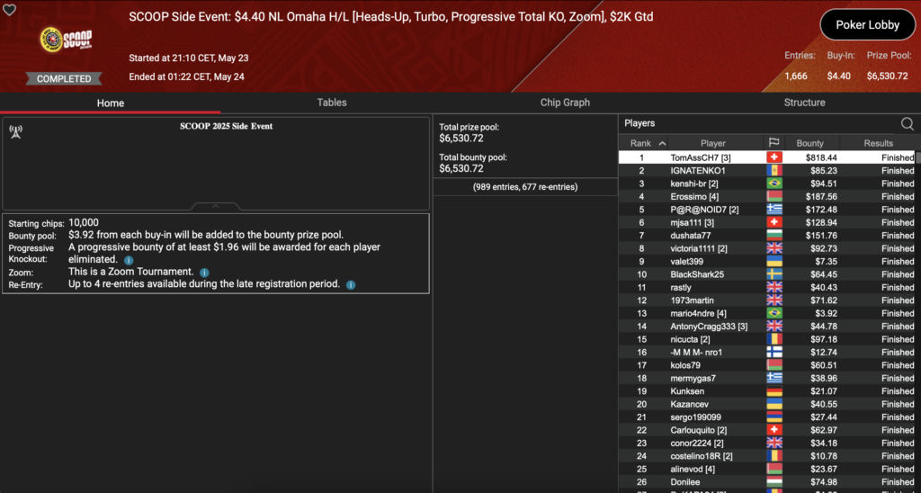 Der nächste Schweizer Sieg fand in einem kleinen Event statt, dem SCOOP Side Event: $4.40 NL Omaha H/L Total PKO ($2k GTD). Hier gab es 1.666 Entries und einen $6.530 Preispool (mehr als dreimal soviel wie die garantierte Preissumme). Der Schweizer Sieger in diesem Turnier war ‚TomAssCH7‚, der dafür $818 mit nach Hause nehmen konnte.