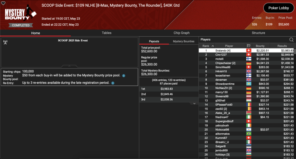 Und dann ging es los mit der Schweizer Dominanz! Beim SCOOP Side Event: $109 NLHE Mystery Bounty ($40k GTD) gab es insgesamt 526 Entries und somit einen $52.600 Preispool. 87 Spieler wurden bezahlt, es gab drei Schweizer und einen Deutschen in den Top 5 und am Ende kam es zu einem rein Schweizer Heads-up. Dabei schlug ‚Sralando‚ seinen Landsmann ‚Ciro1227‘ und erhielt dafür $3.983 plus $2.220 an Bounties.
