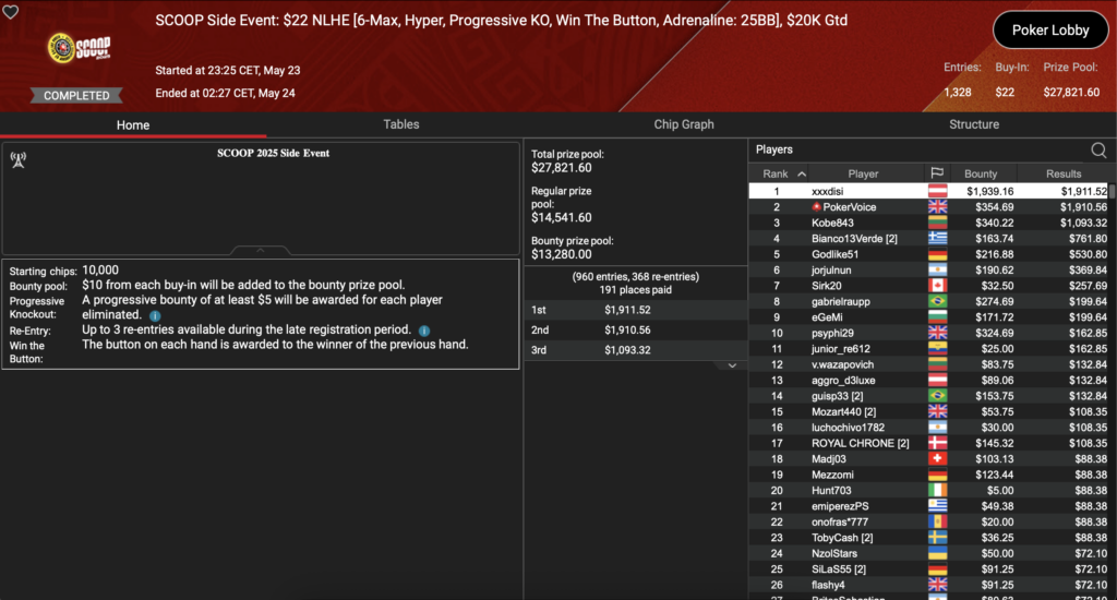 Obwohl es der Tag der Schweizer war, fangen wir mal an mit einem österreichischen Sieg. Das SCOOP Side Event: $22 NLHE PKO Win The Button ($20k GTD) fand insgesamt 1.328 Entries und somit wurde ein Preispool von $27.821 generiert. PokerStars-Ambassador ‚PokerVoice‘ musste sich im Heads-up dem österreichischen Spieler ‚xxxdisi‚ beugen. Letzterer erhielt für seinen Sieg $1.911 plus $1.939 an Bounties.