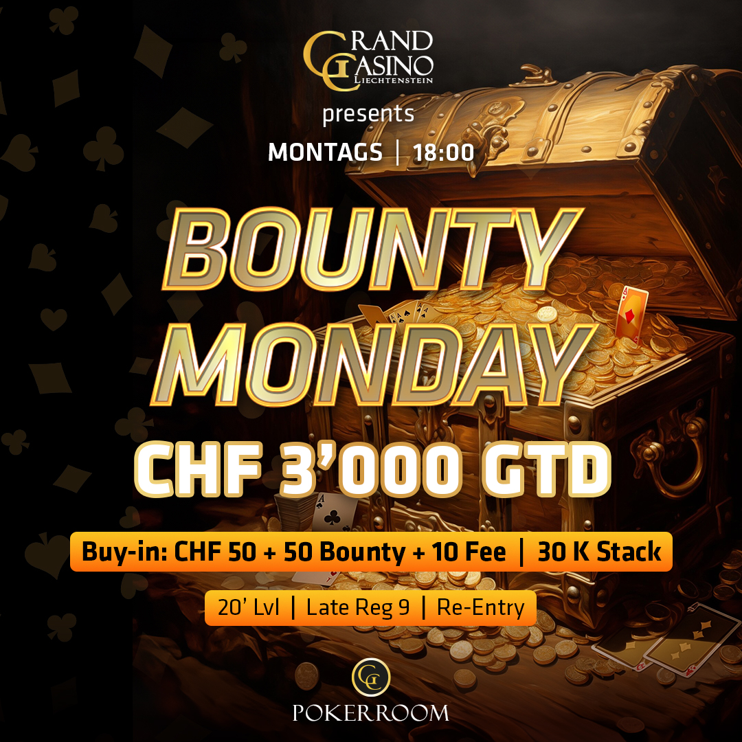 Heute steht im Grand Casino Liechtenstein das CHF 50+50+10 Bounty Monday auf dem Programm – CHF 3.000 werden hier garantiert. 20 Minuten Level werden gespielt, die Late-Reg ist offen bis in Level 9.