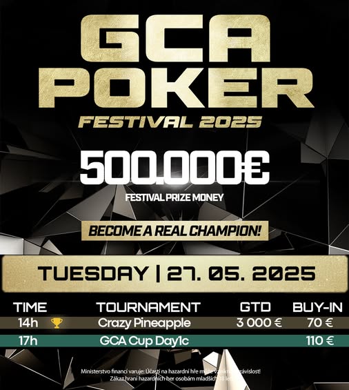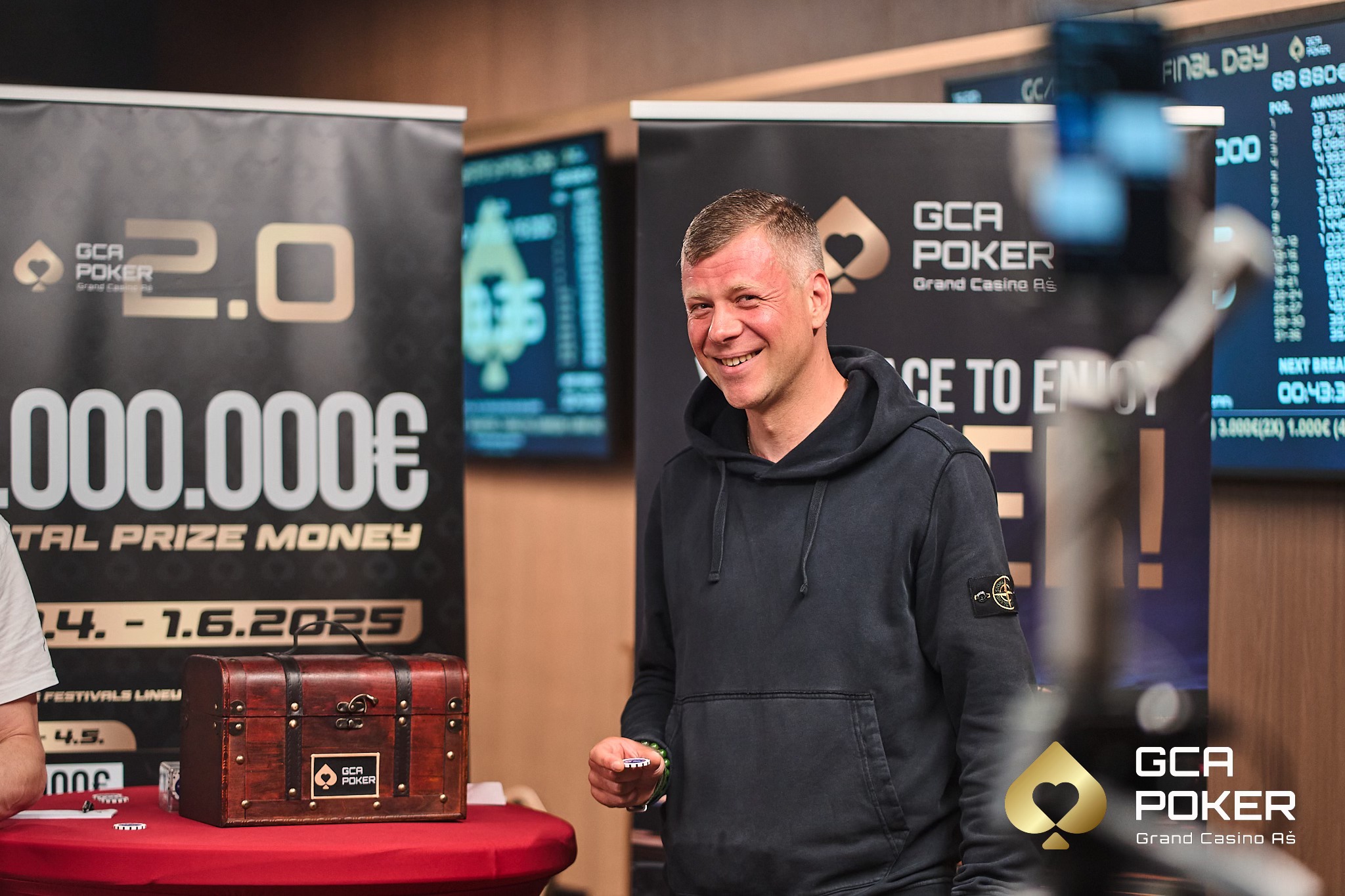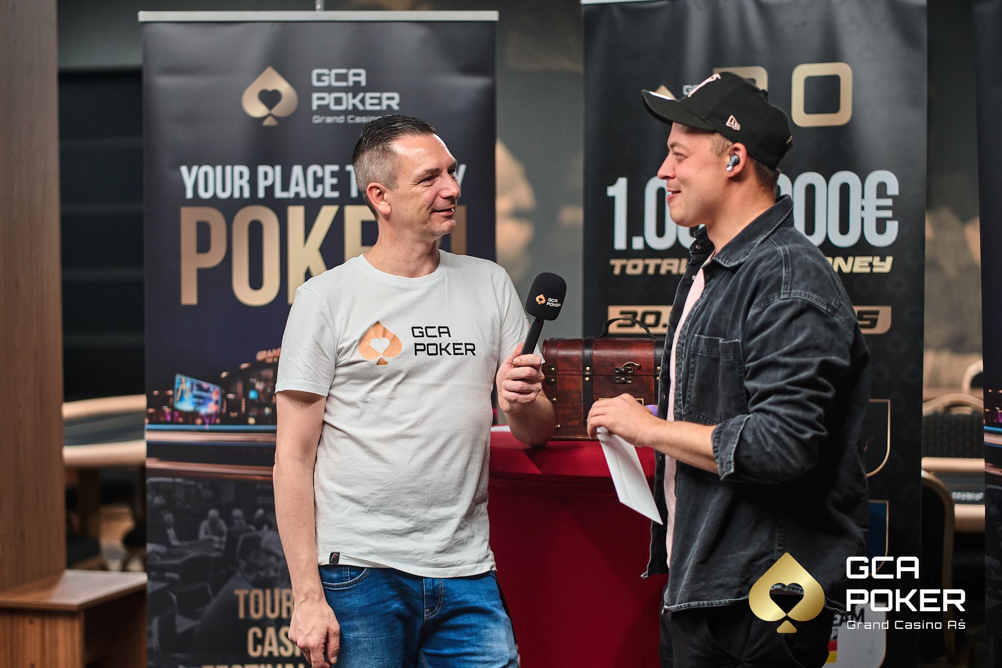 Das GCA Poker Festival im Grand Casino Aš (GCA) ging am Montag in die nächste Runde. Nicht nur die höheren Garantien, das größere Pokerareal oder der TV-Tisch sind neu, auch die Spieltage am Sonntag, Montag und Dienstag sind für viele Spieler*innen Neuland. Das hielt jedoch 45 Entrys nicht davon ab, beim €70 Win the Button auf Trophäenjagd zu gehen, genauso wenig wie 65 Entrys im Tag 1B vom €110 GCA Cup auf die Jagd nach einer Chipstüte für das Finale gingen. Dabei war mit „Lottinha“ ein Spieler in beiden Events vorn, während die W.T.B. Trophäe mit 700 ccm nach Hause chauffiert wurde.