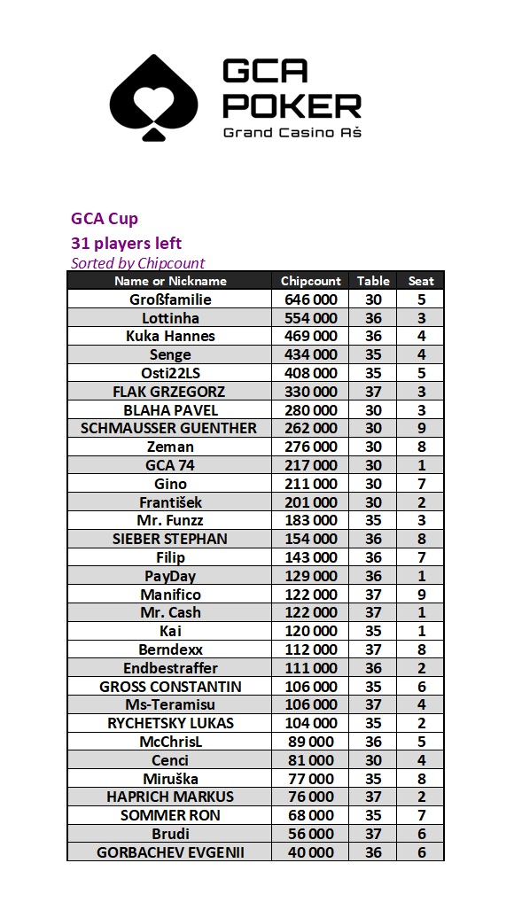 In Asch steht heute die Entscheidung des GCA Cups um 17:00 Uhr auf dem Programm sowie der erste Flight (1a) des €200+20 GCA Main Events mit €200.000, das mit 40 Minuten Level gespielt werden um 18:00 Uhr.