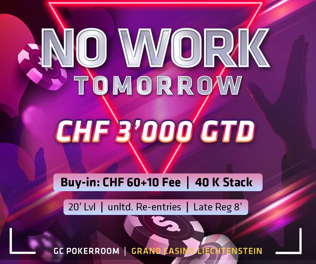 Heute wird im Grand Casino Liechtenstein das CHF 60+10 No Work Tomorrow gespielt – CHF 3.000 werden garantiert. Alle Spieler starten mit 40.000 Chips und 20 Minuten Level laufen.