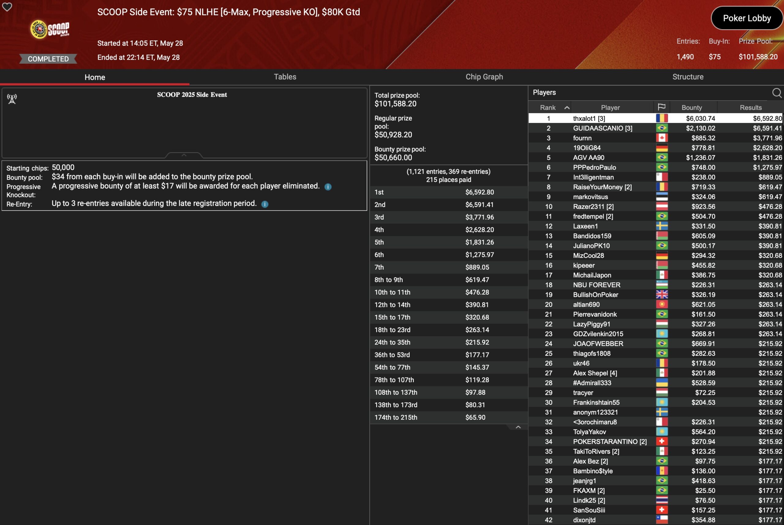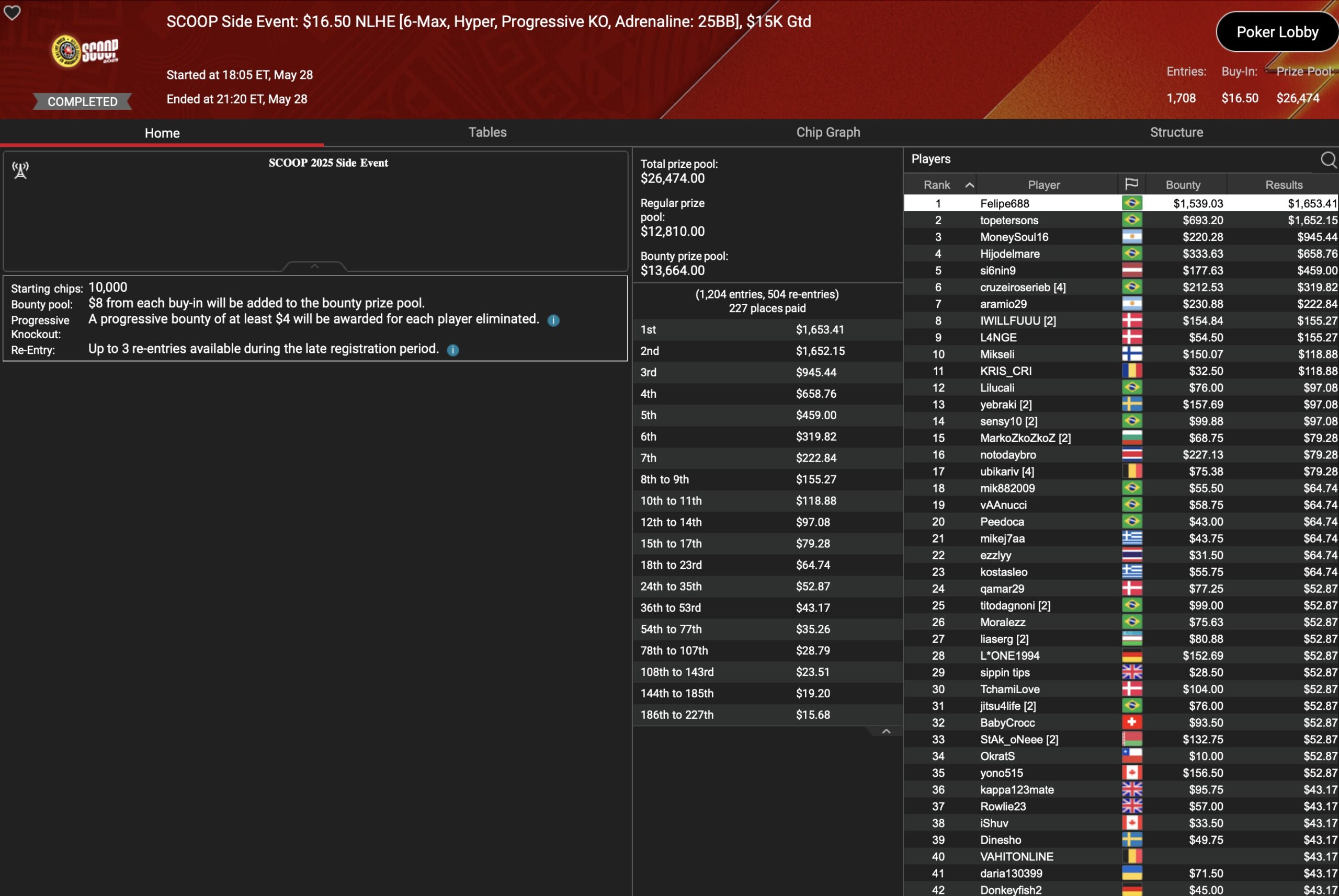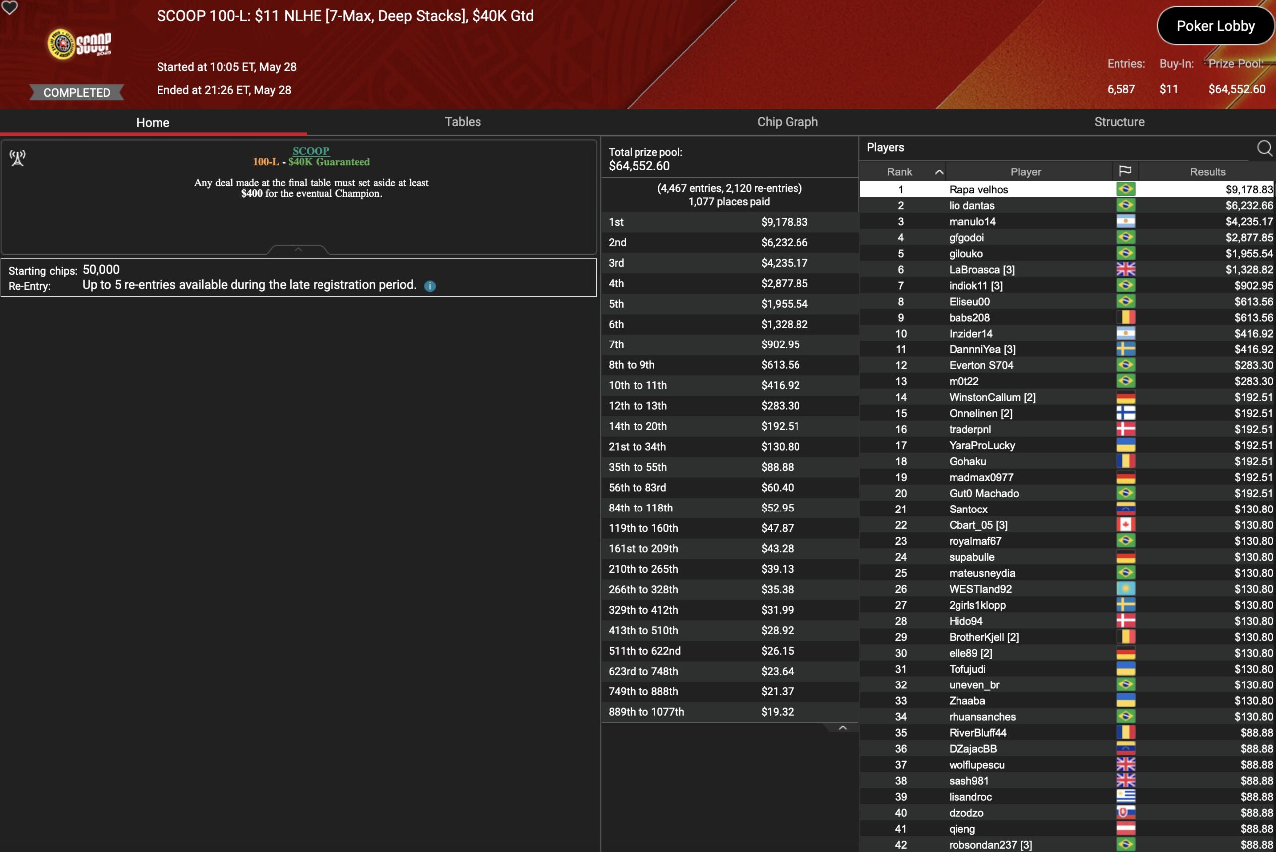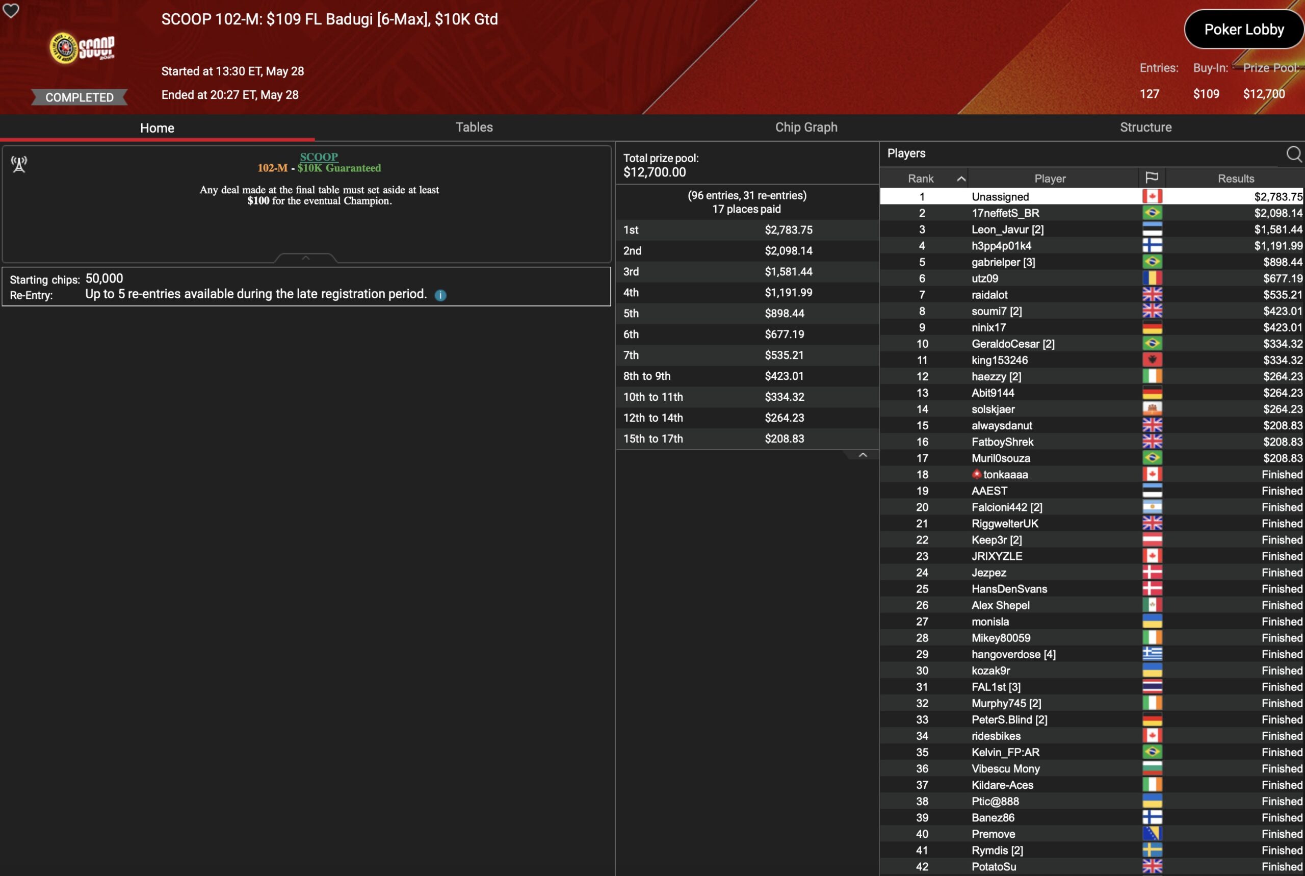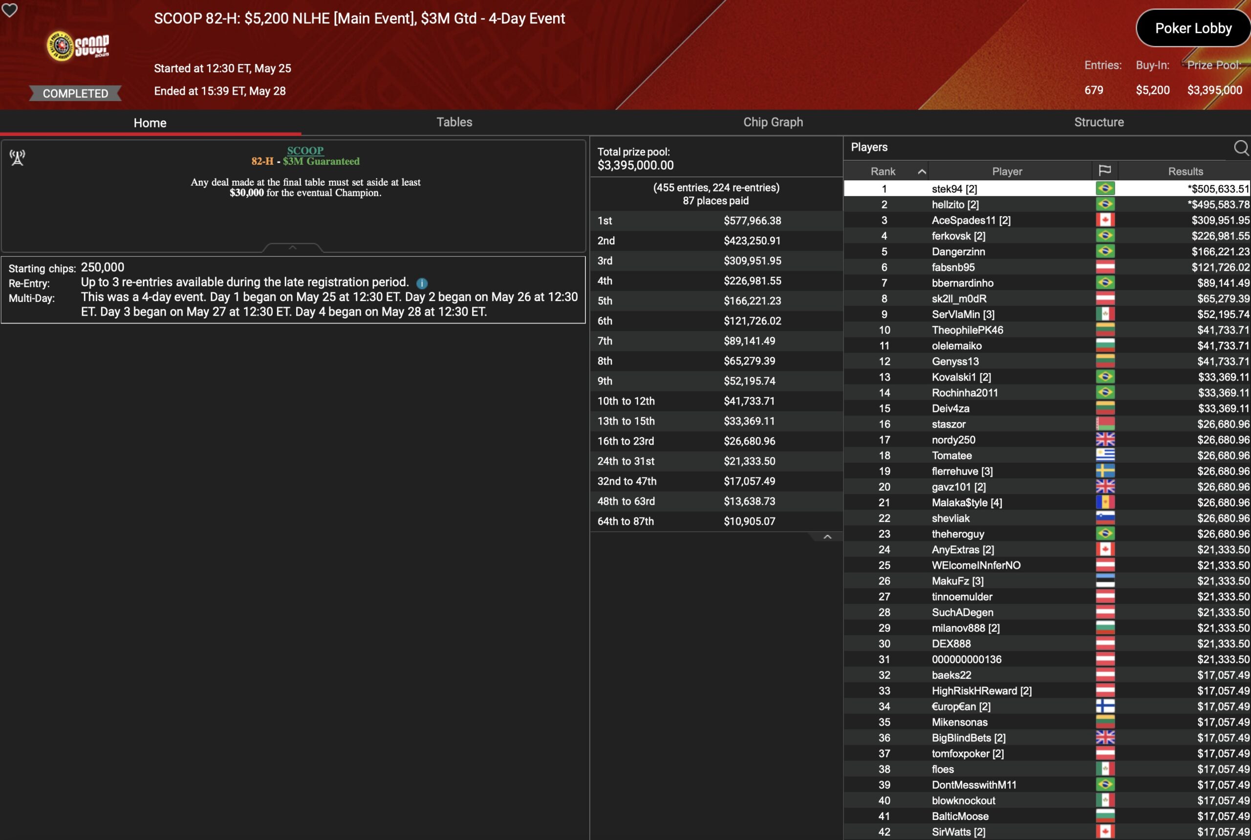 Das Hauptaugenmerk war jedoch auf das $5.200 SCOOP Main Event im High Buy-In Tier gerichtet. Hier kamen 679 (455+224) High Roller und Qualifikanten zusammen, um um $3.395.000 im Preispool zu spielen. Der Final Table des 4-tägigen Events wurde livegestreamt. Hier konnten mit EPT Champion Oliver „sk2ll_m0dr“ Weis und „fabsnb95“ zwei Spieler unter österreichischer Flagge Platz nehmen. Am Ende sollten es $65.279 für Weis auf Rang 8 und $121.726 für „fabsnb95“ auf Rang 6 werden. Mit dem Ausscheiden von „AceSpades11“ aus Kanada auf Rang 3 ($309.951) einigten sich die beiden Heads-Up Kontrahenten auf einen Deal. Der obligatorische Restbetrag, die Trophy und der nicht zu verachtende Titel als SCOOP Main Event Champion wurden weiter ausgespielt. Im entscheidenden Prflop All-In war der A4s Push von „hellzito“ aus Brasilien nicht erfolgreich gegen K9o seines Landsmanns „stek94“. Beide konnten sich allerdings um etwas eine halbe Million Dollar Preisgeld freuen. $495.583 gingen an „hellzito“, $505.633 an den neuen SCOOP Main Event Champion „stek94“.