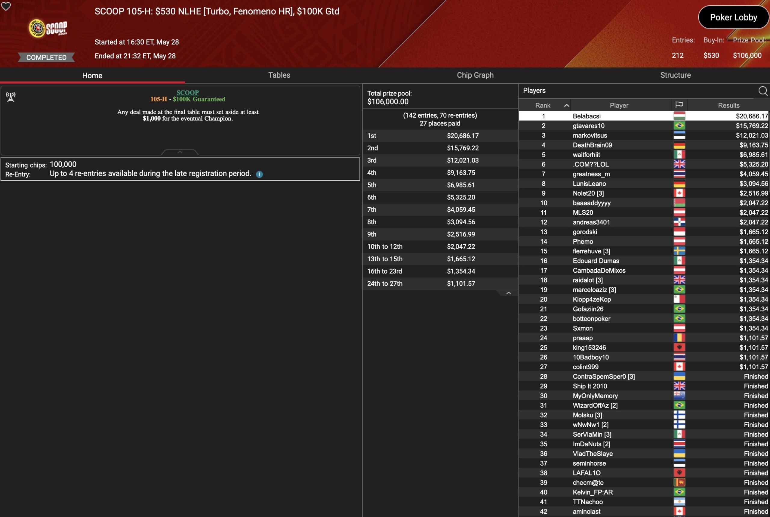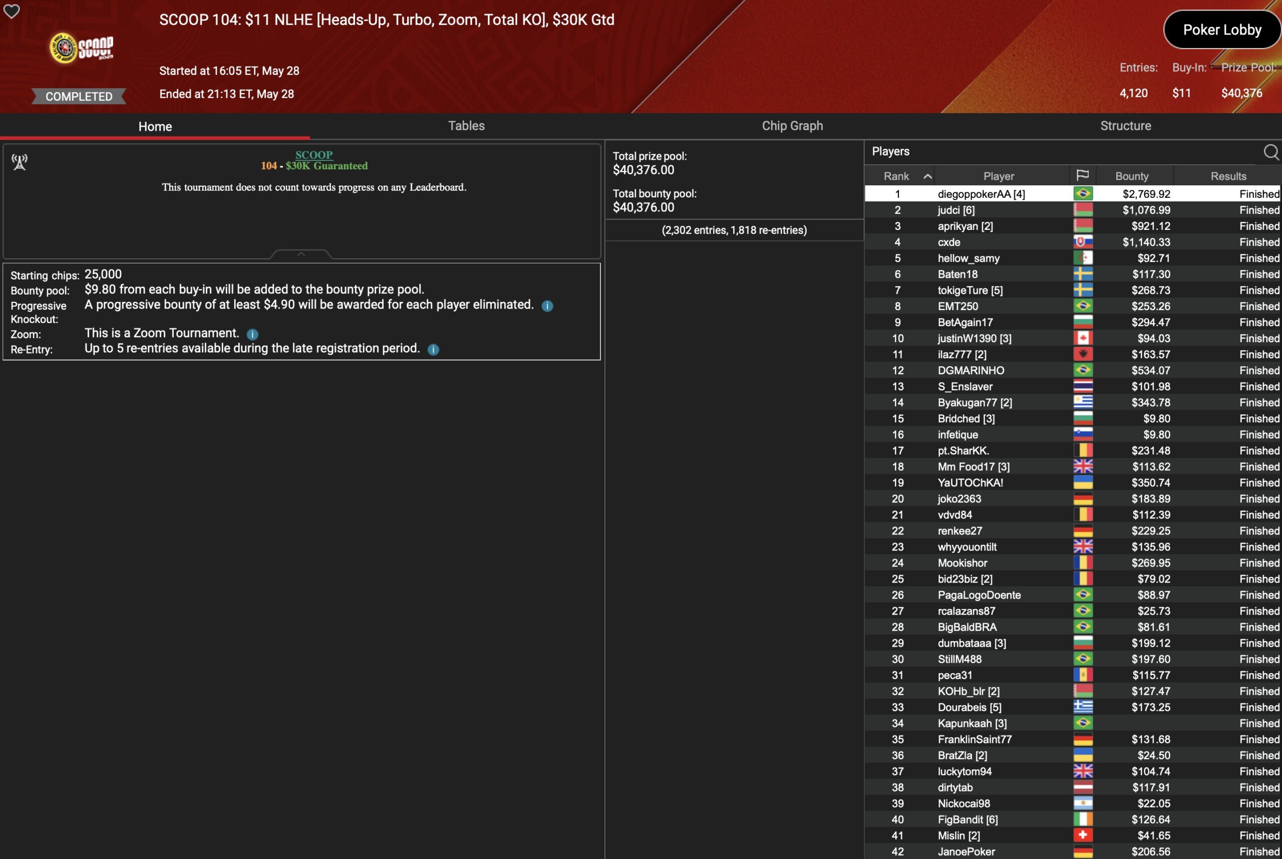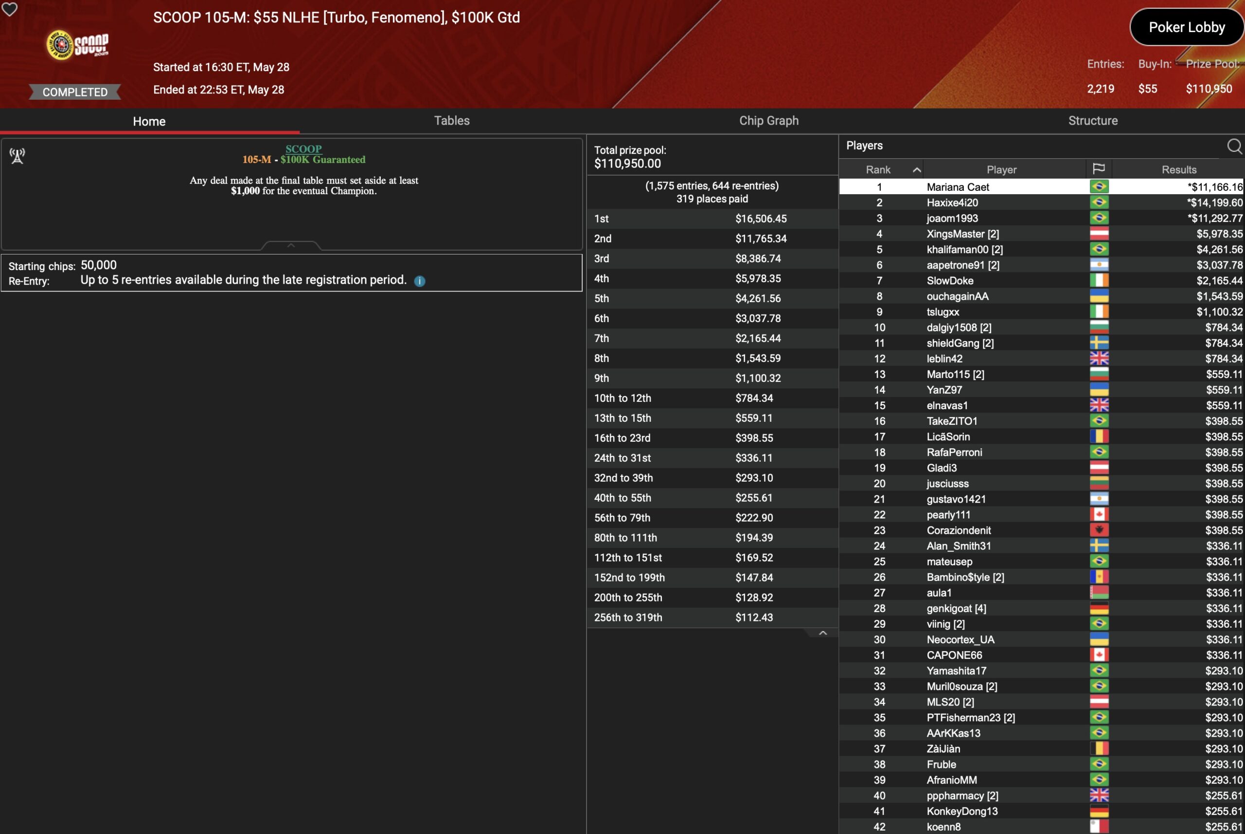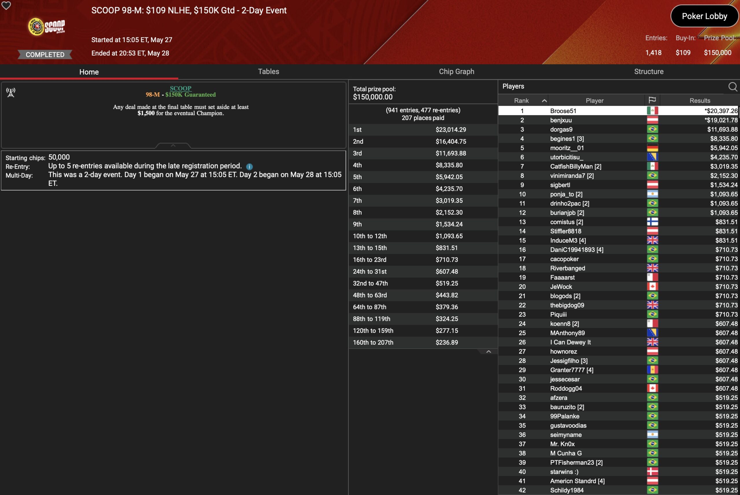 Das Hauptaugenmerk war jedoch auf das $5.200 SCOOP Main Event im High Buy-In Tier gerichtet. Hier kamen 679 (455+224) High Roller und Qualifikanten zusammen, um um $3.395.000 im Preispool zu spielen. Der Final Table des 4-tägigen Events wurde livegestreamt. Hier konnten mit EPT Champion Oliver „sk2ll_m0dr“ Weis und „fabsnb95“ zwei Spieler unter österreichischer Flagge Platz nehmen. Am Ende sollten es $65.279 für Weis auf Rang 8 und $121.726 für „fabsnb95“ auf Rang 6 werden. Mit dem Ausscheiden von „AceSpades11“ aus Kanada auf Rang 3 ($309.951) einigten sich die beiden Heads-Up Kontrahenten auf einen Deal. Der obligatorische Restbetrag, die Trophy und der nicht zu verachtende Titel als SCOOP Main Event Champion wurden weiter ausgespielt. Im entscheidenden Prflop All-In war der A4s Push von „hellzito“ aus Brasilien nicht erfolgreich gegen K9o seines Landsmanns „stek94“. Beide konnten sich allerdings um etwas eine halbe Million Dollar Preisgeld freuen. $495.583 gingen an „hellzito“, $505.633 an den neuen SCOOP Main Event Champion „stek94“.