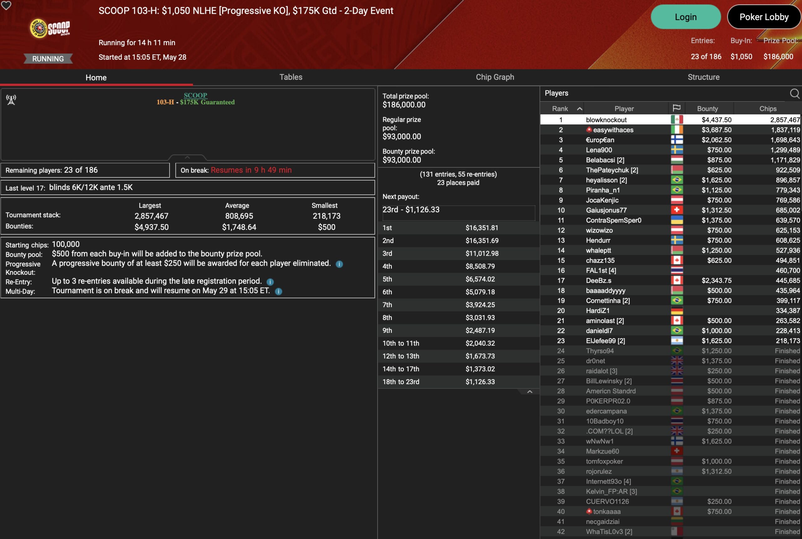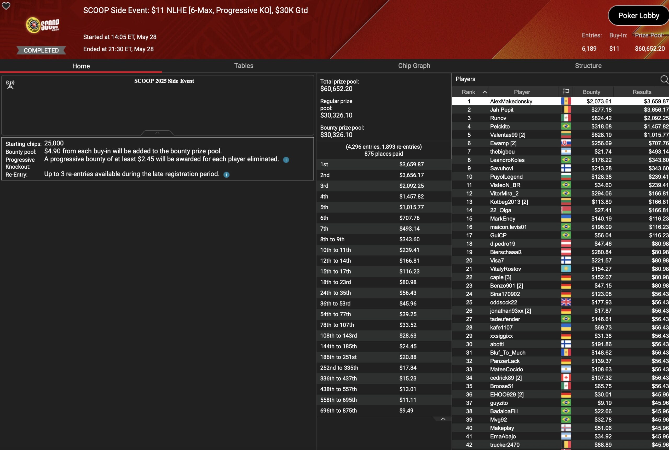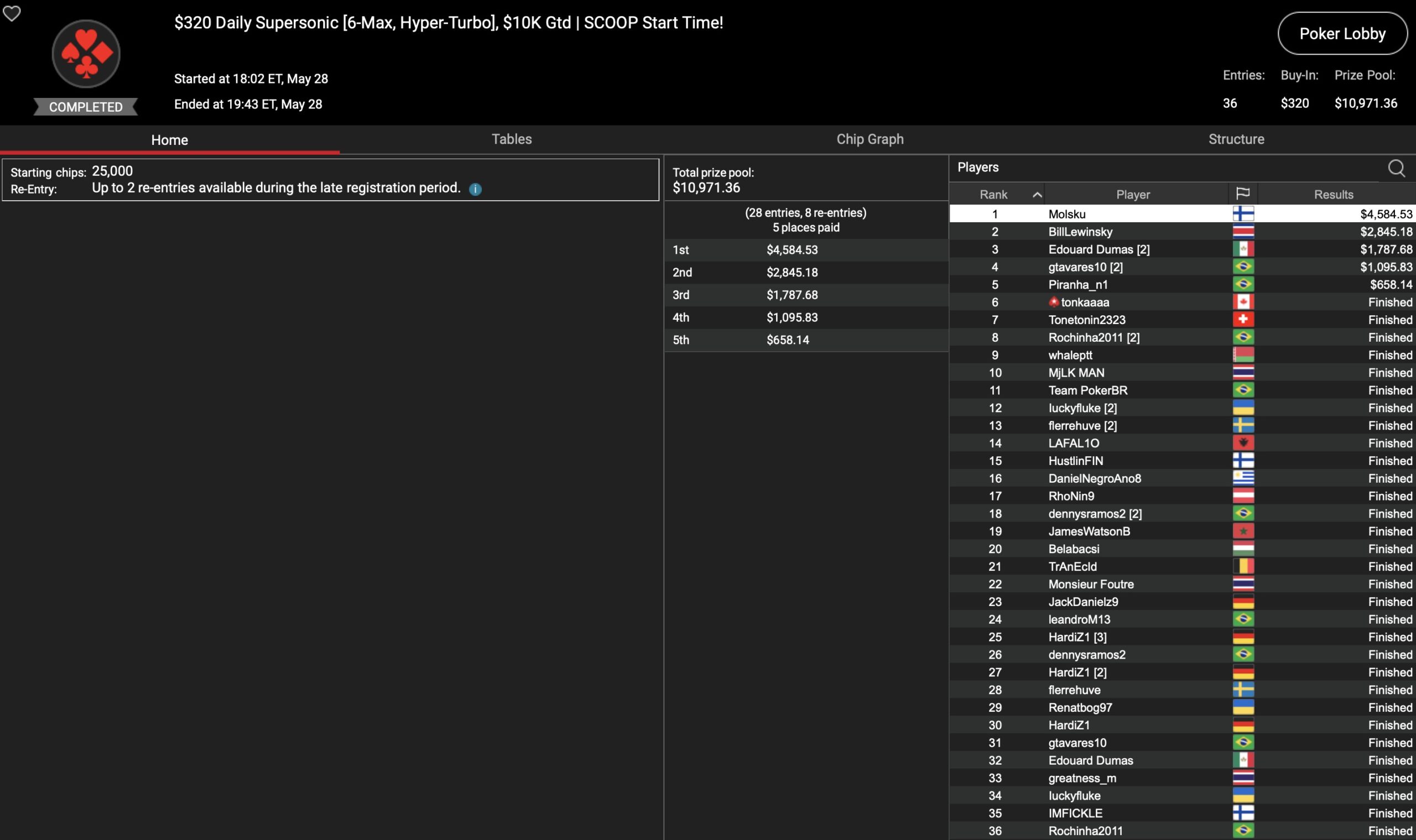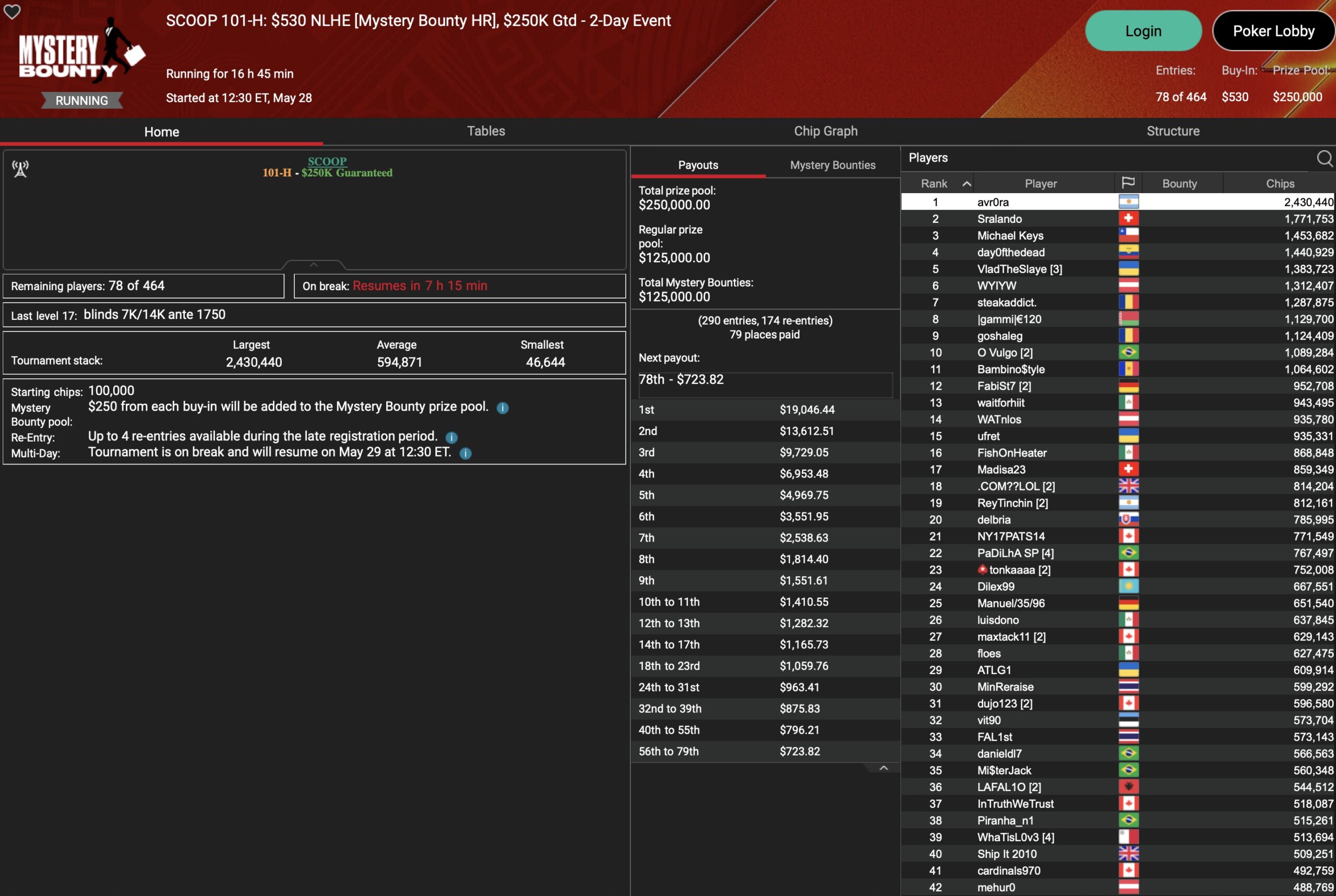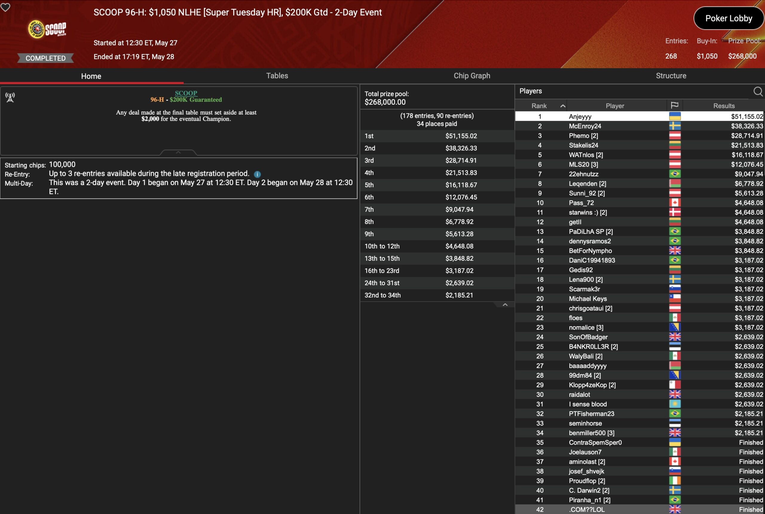 Das Hauptaugenmerk war jedoch auf das $5.200 SCOOP Main Event im High Buy-In Tier gerichtet. Hier kamen 679 (455+224) High Roller und Qualifikanten zusammen, um um $3.395.000 im Preispool zu spielen. Der Final Table des 4-tägigen Events wurde livegestreamt. Hier konnten mit EPT Champion Oliver „sk2ll_m0dr“ Weis und „fabsnb95“ zwei Spieler unter österreichischer Flagge Platz nehmen. Am Ende sollten es $65.279 für Weis auf Rang 8 und $121.726 für „fabsnb95“ auf Rang 6 werden. Mit dem Ausscheiden von „AceSpades11“ aus Kanada auf Rang 3 ($309.951) einigten sich die beiden Heads-Up Kontrahenten auf einen Deal. Der obligatorische Restbetrag, die Trophy und der nicht zu verachtende Titel als SCOOP Main Event Champion wurden weiter ausgespielt. Im entscheidenden Prflop All-In war der A4s Push von „hellzito“ aus Brasilien nicht erfolgreich gegen K9o seines Landsmanns „stek94“. Beide konnten sich allerdings um etwas eine halbe Million Dollar Preisgeld freuen. $495.583 gingen an „hellzito“, $505.633 an den neuen SCOOP Main Event Champion „stek94“.