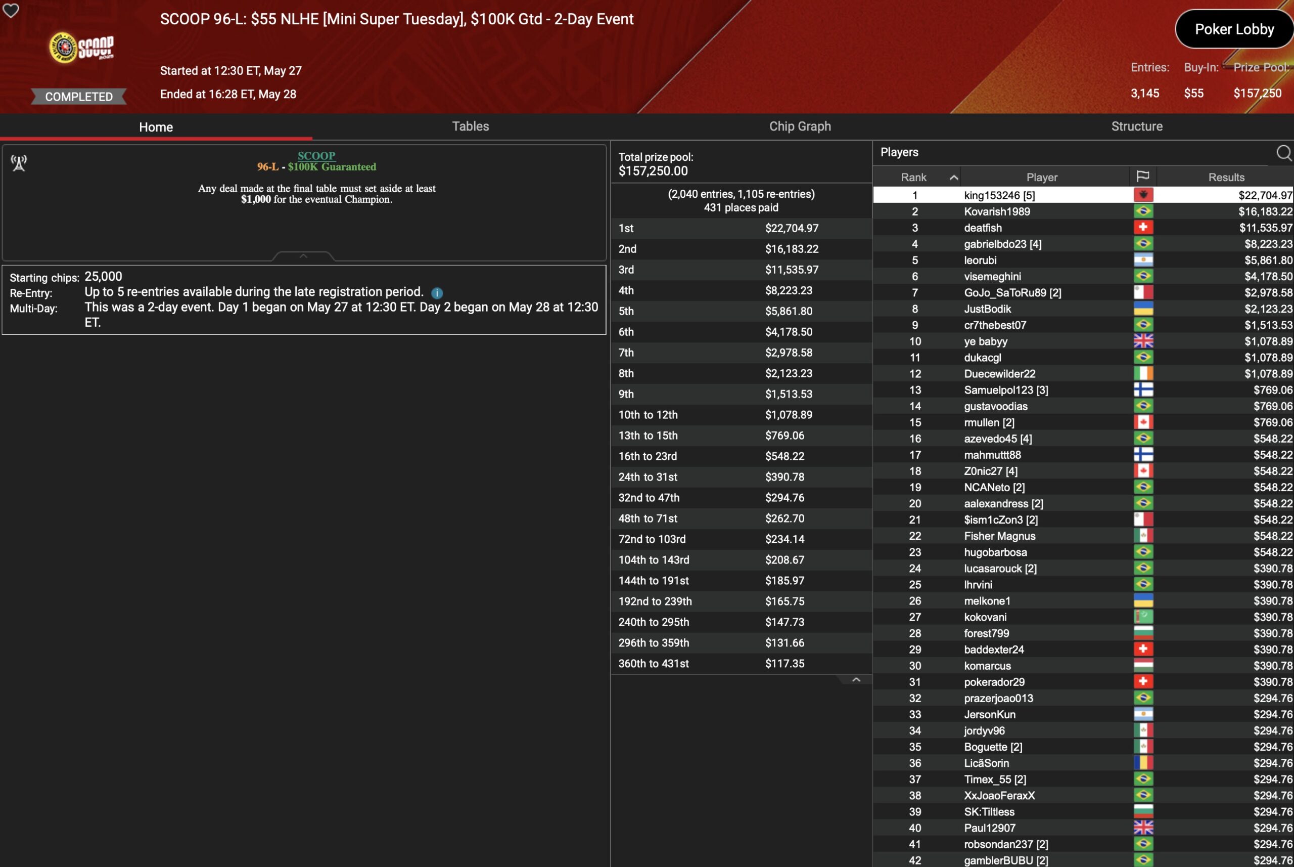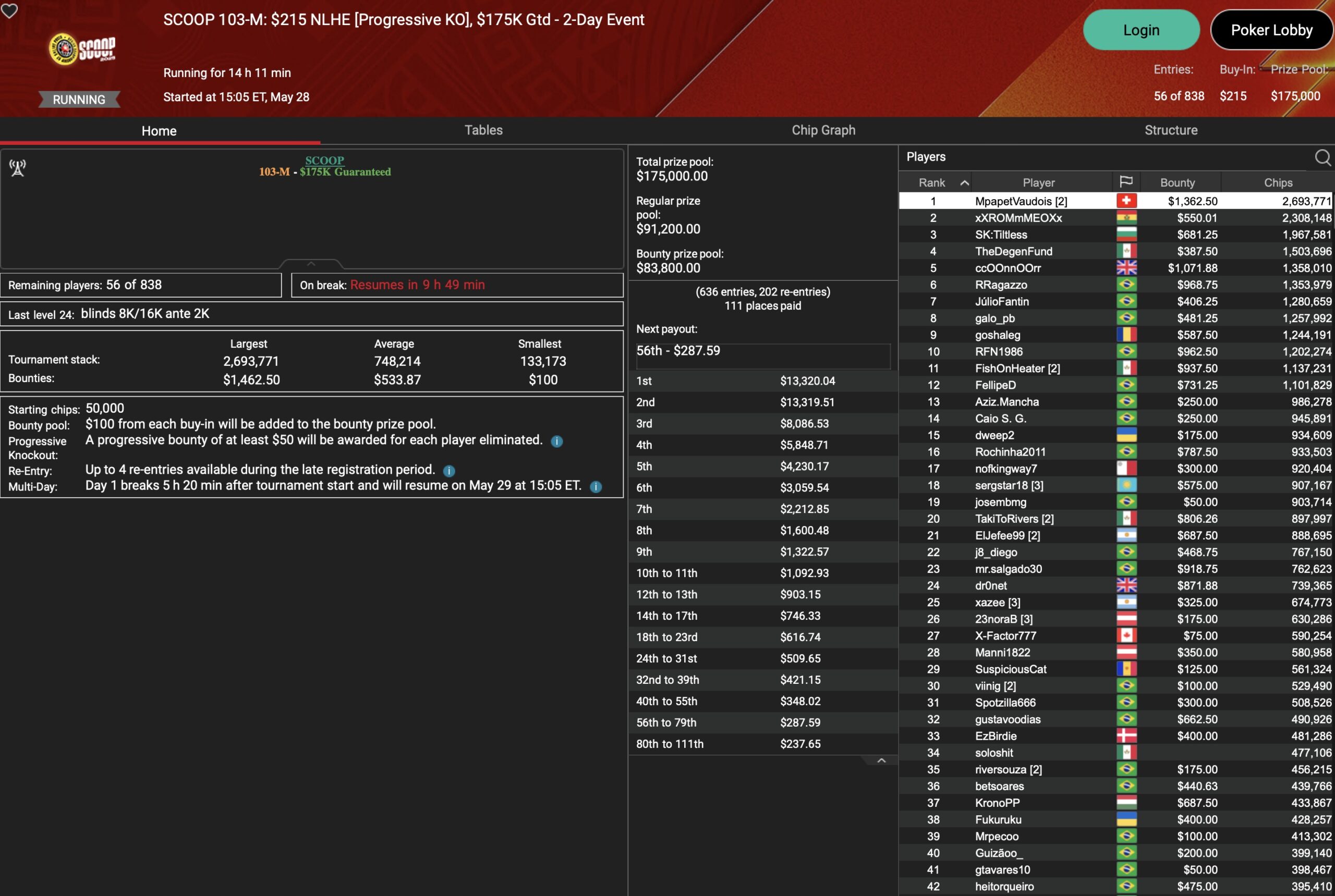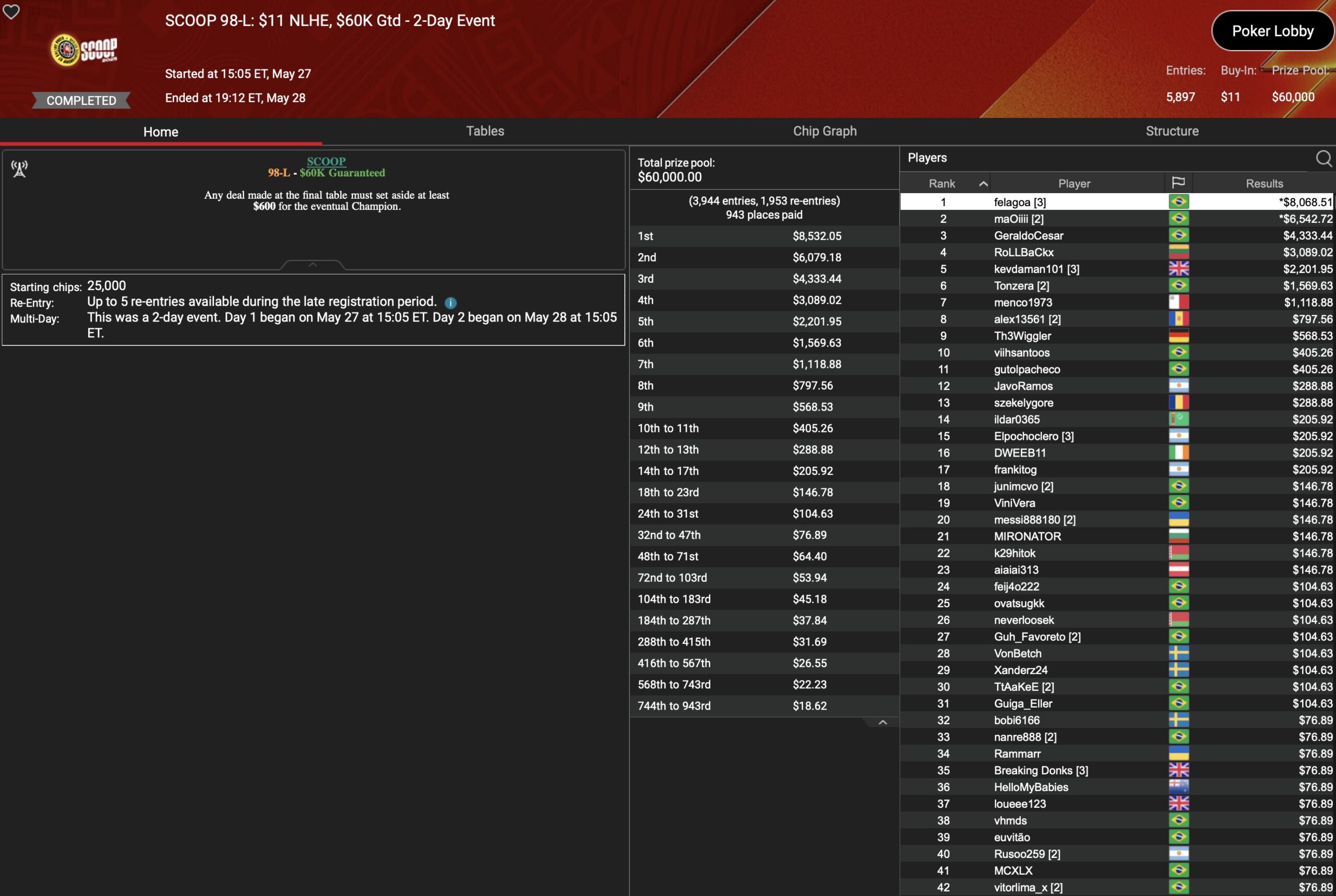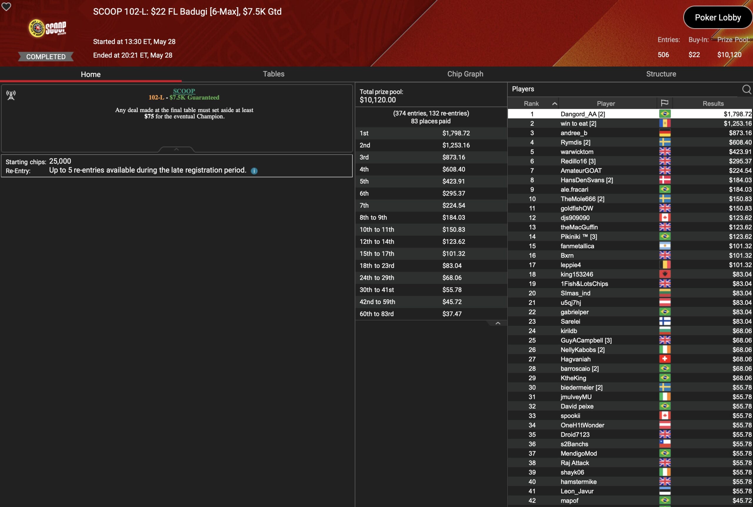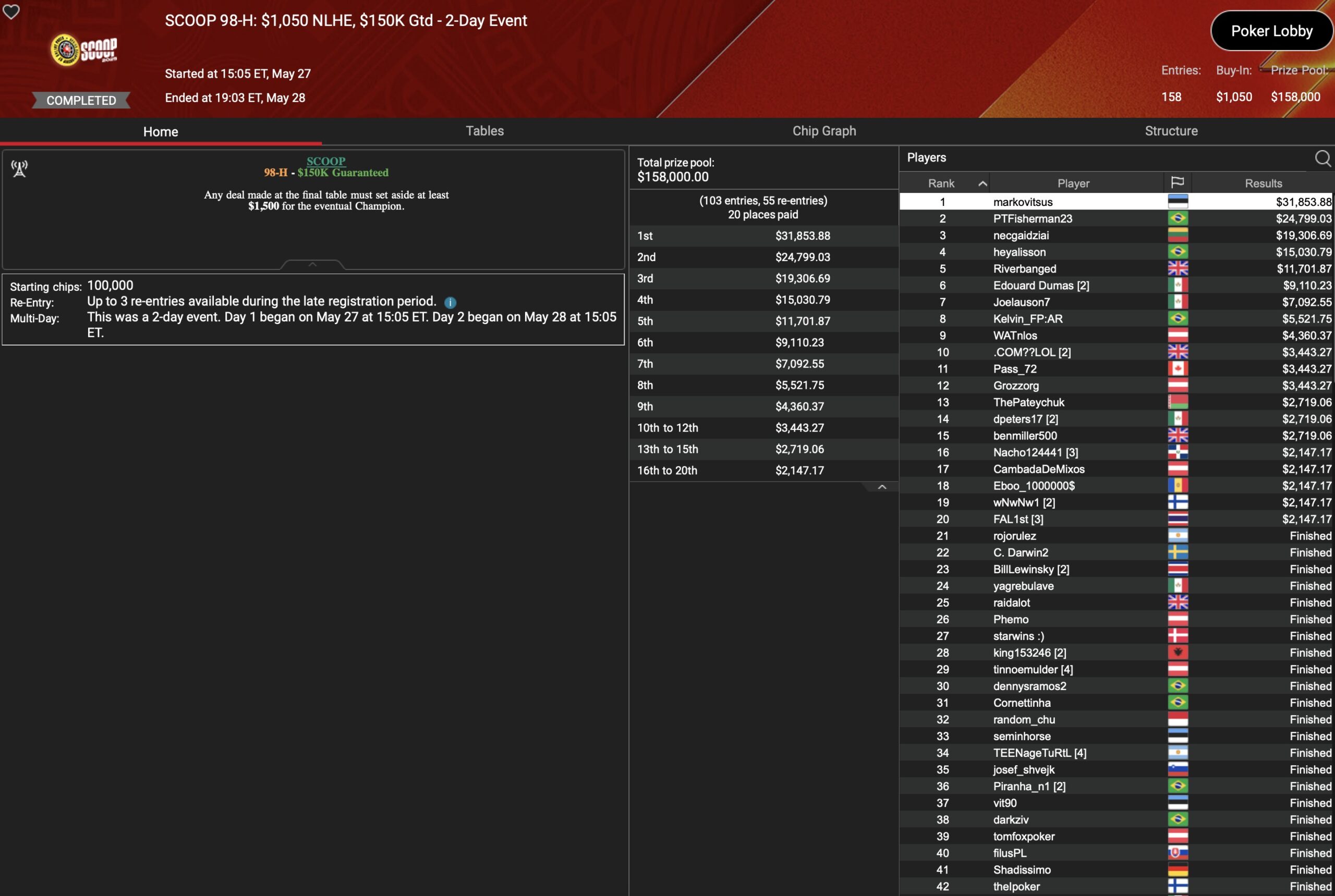 Das Hauptaugenmerk war jedoch auf das $5.200 SCOOP Main Event im High Buy-In Tier gerichtet. Hier kamen 679 (455+224) High Roller und Qualifikanten zusammen, um um $3.395.000 im Preispool zu spielen. Der Final Table des 4-tägigen Events wurde livegestreamt. Hier konnten mit EPT Champion Oliver „sk2ll_m0dr“ Weis und „fabsnb95“ zwei Spieler unter österreichischer Flagge Platz nehmen. Am Ende sollten es $65.279 für Weis auf Rang 8 und $121.726 für „fabsnb95“ auf Rang 6 werden. Mit dem Ausscheiden von „AceSpades11“ aus Kanada auf Rang 3 ($309.951) einigten sich die beiden Heads-Up Kontrahenten auf einen Deal. Der obligatorische Restbetrag, die Trophy und der nicht zu verachtende Titel als SCOOP Main Event Champion wurden weiter ausgespielt. Im entscheidenden Prflop All-In war der A4s Push von „hellzito“ aus Brasilien nicht erfolgreich gegen K9o seines Landsmanns „stek94“. Beide konnten sich allerdings um etwas eine halbe Million Dollar Preisgeld freuen. $495.583 gingen an „hellzito“, $505.633 an den neuen SCOOP Main Event Champion „stek94“.