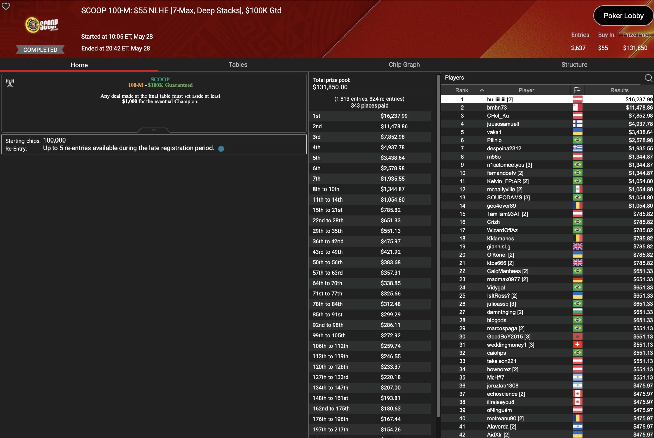 Einen weiteren Sieg für die D-A-CH-L Community gab es durch den Stars-Reg mit den 10 „i“! Unter 2.637 Entrys setzte sich nach 10 Stunden 37 Minuten Spielzeit „huiiiiiiiiii“ aus Österreich im $55 NLHE Deep Stacks (#100-M) durch. Dafür kassierte er $16.237 Siegprämie und die begehrte SCOOP Trophy!