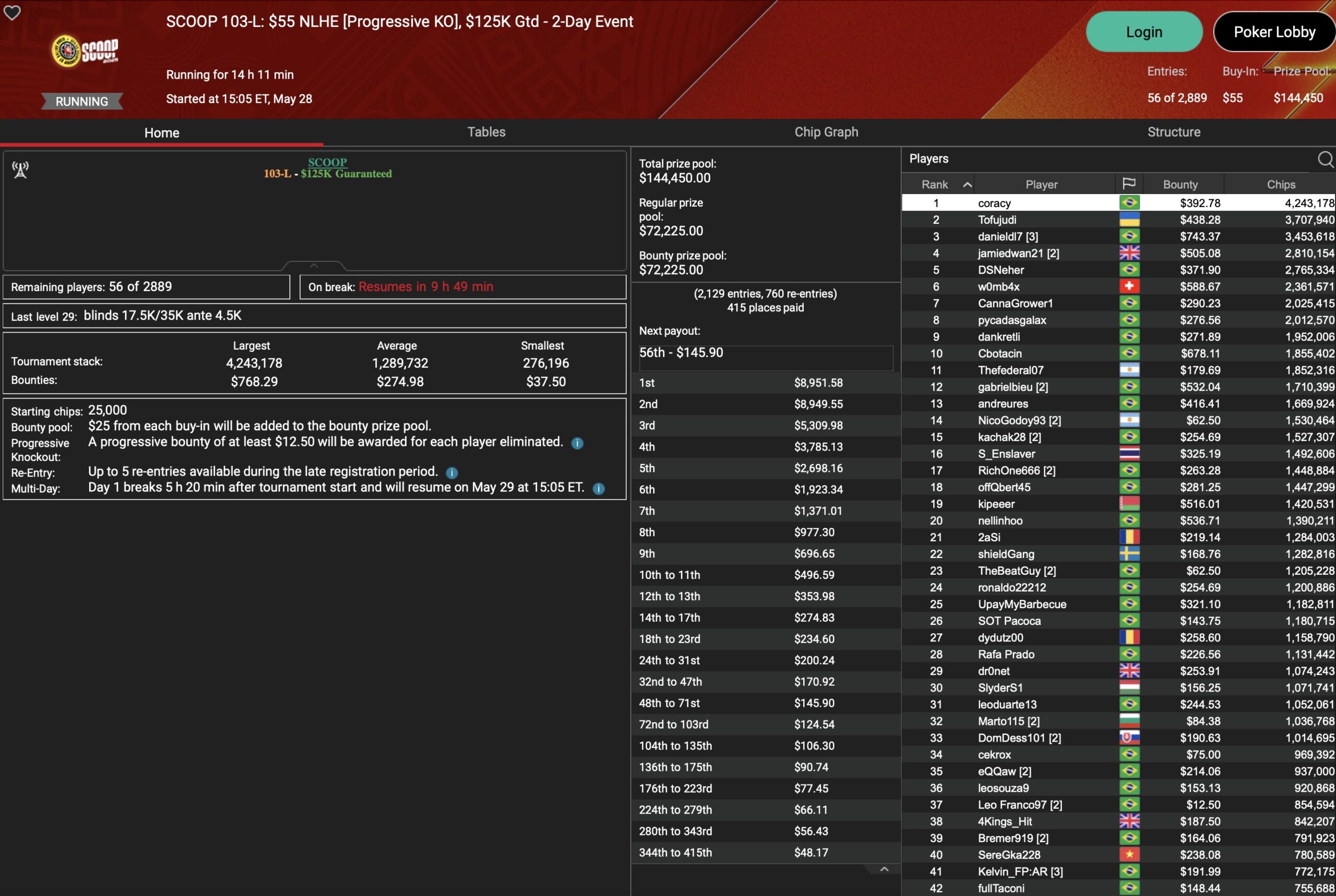 Neben den SCOOP Main Event Turnieren lag des Augenmerk am Mittwoch auf den Final Tagen vom Super Tuesday. Im $55 Mini Super Tuesday konnte „deatfish“ aus der Schweiz seinen SCOOP-Lauf mit Rang 3 unter 3.145 (2.040+1.105) weiterführen. Für diese starke performance gingen weitere $11.535 aus dem $157.250 Preispool in die Schweiz.