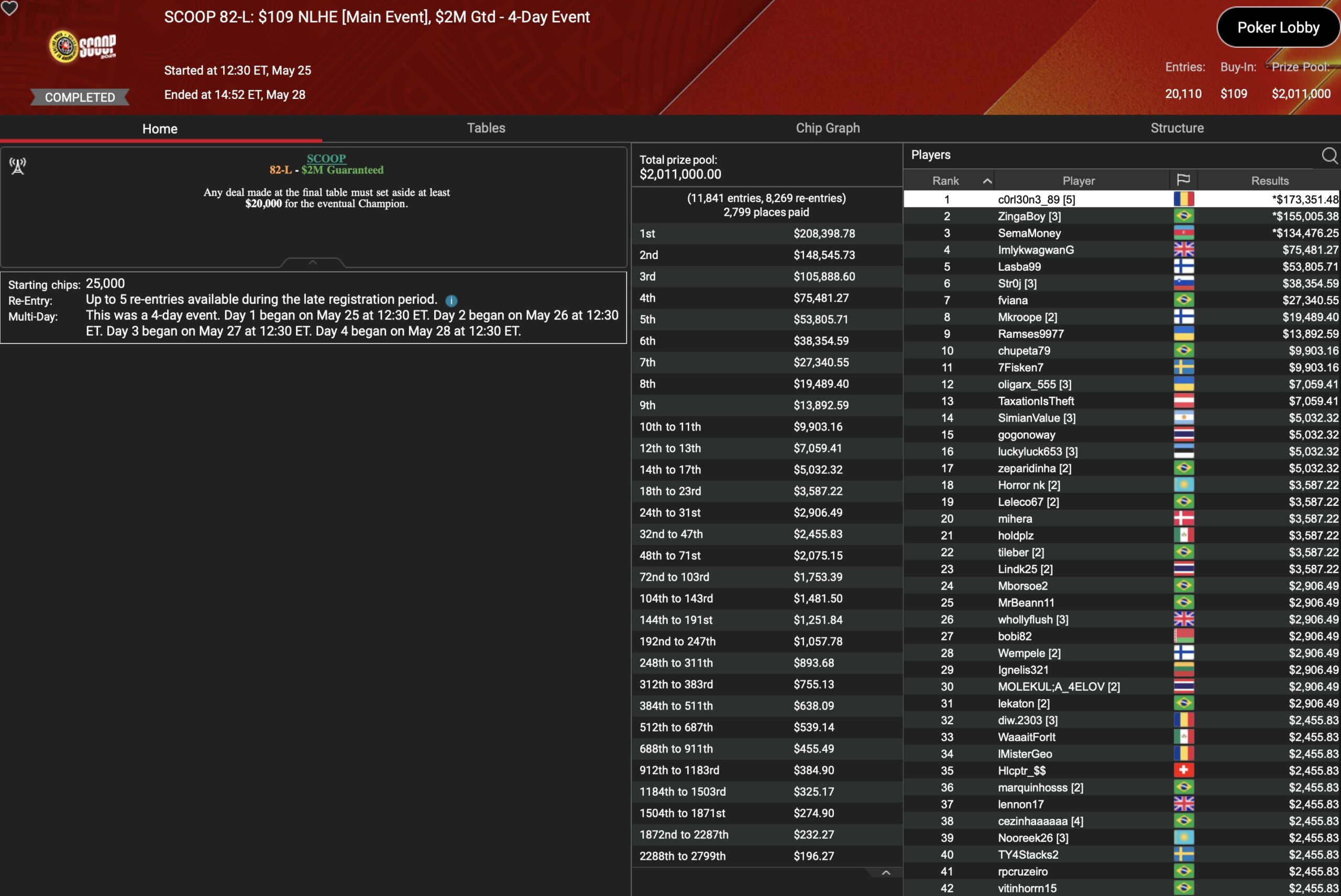 Der Sieg unter 20.110 (11.841+8.269) Entrys im $109 Main Event in der Low-Tier-Ausgabe (#82-L) ging an „c0rl30n3_89“ aus Rumänien und damit $173.351 Top-Payout. Die letzten 3 hatten einen Deal ausgehandelt, der ihnen die dicksten Tortenstücke aus dem $2.011.000 Preispool sicherte. D-A-CH-L-Spieler waren nicht an diesem Final Table zu finden.