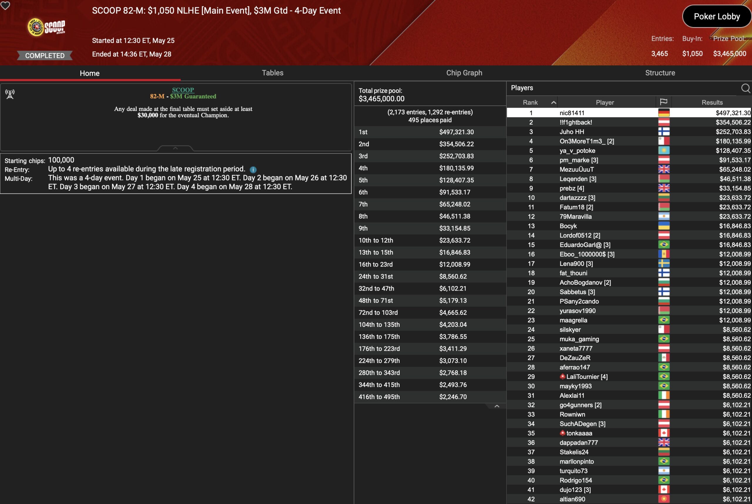 Dafür schlugen die deutschsprachigen Spieler so richtig beim $1.050 SCOOP Main Event (#82-M) zu. Hier war nicht nur Pedro „pm_marke“ Marques auf Rang 6 ($91.533) einer der Final Table Casher, auch die Payouts für die Ränge 1 und 2 aus dem $3.465.000 Preispool gingen an Spieler aus dem DACHL. „!!f1ghtback!“ aus Österreich holte riesige $354.506 Payout und war damit „nur“ zweiter Sieger. Fast eine halbe Million Dollar gab es für „nic81411“, der als SCOOP Main Event Champion unter 3.465 (2.173+1.292) Entrys $497.321 kassierte!