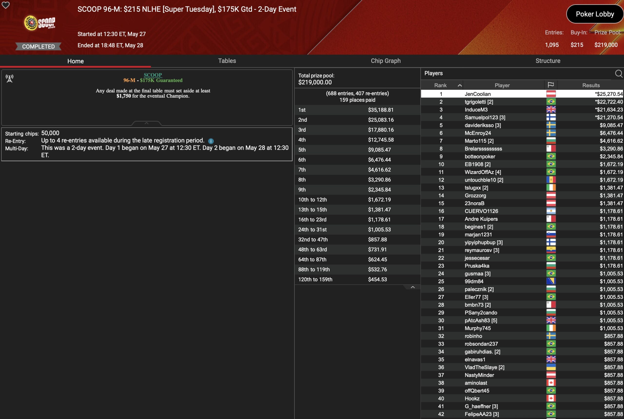 Das Top-Ergebnis aus deutschsprachiger Sicht holte „JenCoolian“ im $215 Super Tuesday. Die letzten 5 von 1.095 (688+407) Entrys einigten sich auf einen Deal. Der obligatorische Restbetrag und die Trophy wurden ausgespielt. Am Ende ging der Sieg zusammen mit $25.270 aus dem $219.000 Preispool nach Österreich!