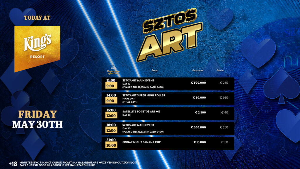 Am gestrigen Donnerstag gab es im King’s Resort Rozvadov wieder ordentlich Action im Rahmen des $SZTO$ ART Festivals powered by $ZTO$ Game. Aber auch im King’s Casino Prag wurde gepokert.