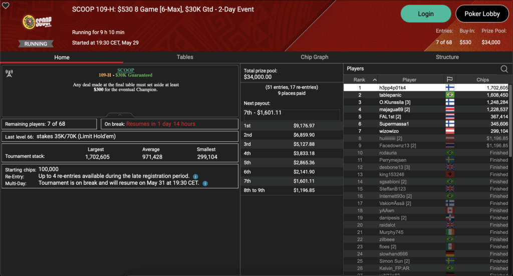 Wie auch die vorherigen beiden Turniere ist das SCOOP 109-H: $530 8 Game ($30k GTD) ein 2-Tages-Event. Es gab 68 Entries und somit einen $34.000 Preispool. Morgen wird das Finale ausgespielt und momentan hat ‚h3pp4p01k4‚ aus Finnland die beste Ausgangsposition. Aber wir haben auch noch eine DACH-Hoffnung im Rennen mit Ole ‚wizowizo‘ Schemion auf Rang 7 als Shorty. $9.176 warten auf den Sieger und momentan haben alle sieben verbleibenden Spieler $1.601 sicher.