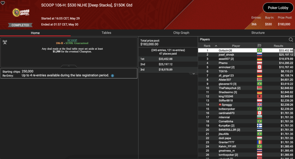 Fangen wir an mit dem SCOOP 106-H: $530 NLHE Deep Stacks ($150k GTD), das mit 366 Entries einen $183.000 Preispool generierte. 47 Spieler bekamen einen Anteil davon ab, und die beste DACH-Platzierung belegte ‚assel007‘ aus Deutschland mit Platz 3 für $18.978. Der Sieger kam allerdings aus Brasilien. ‚Gofaziin26‚ nahm dafür $33.452 mit nach Hause.