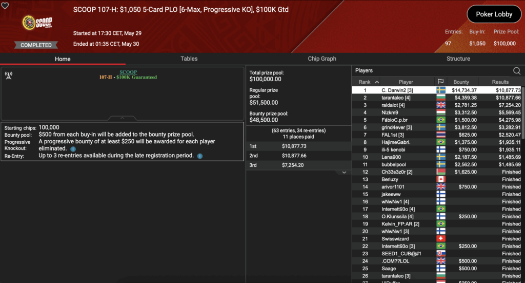 Eines der größten Buy-in Events des gestrigen Tages war das SCOOP 107-H: $1.050 5-Card PLO PKO ($100k GTD). 97 mal wurde das Buy-in bezahlt und somit die Garantie knapp verfehlt. Der schwedische Sieger Simon ‚C.Darwin2‚ Mattsson freute sich besonders darüber, denn er durfte $10.877 plus $14.734 an Bounties einstreichen.