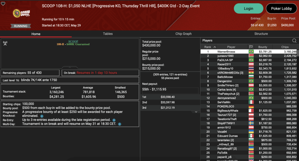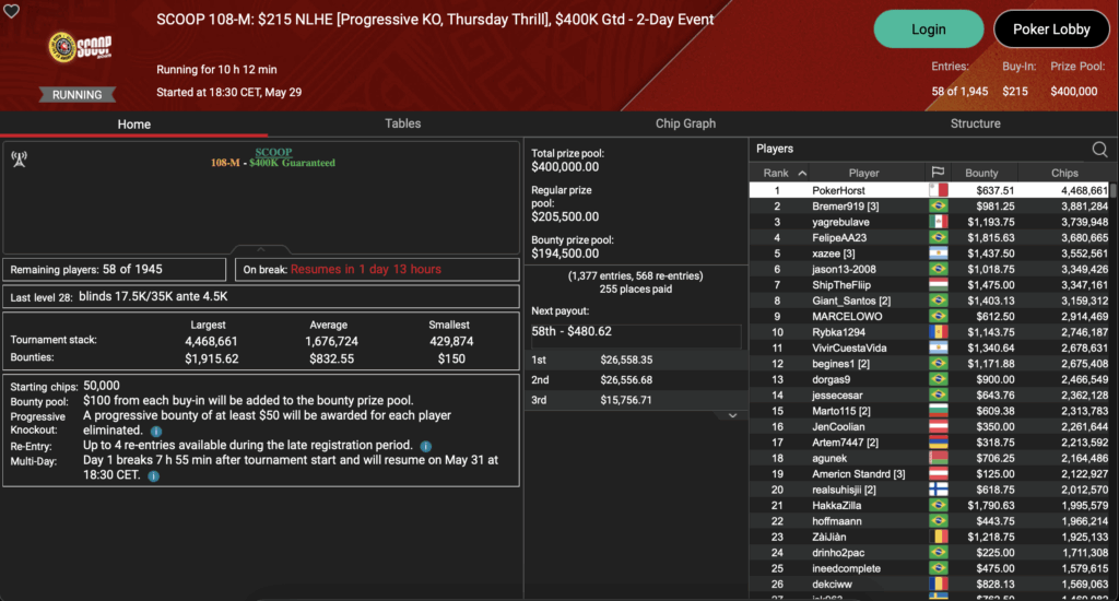 Beim SCOOP 108-M: $215 NLHE Thursday Thrill PKO High Roller ($400k GTD) handelt es sich um ein 2-Tages-Event, das heißt, wir können heute noch keinen Sieger vermelden. Auch hier waren es mit 1.945 knapp nicht genug Entries, um die Garantie zu erreichen. Die beste Ausgangsposition für Tag 2 hat der Malteser ‚PokerHorst‚ und ansonsten ist die Rangliste voll mit brasilianischen Flaggen. Das Spiel wird erst am Samstag zu Ende gespielt und wir werden den Gewinner des $26.558 Top-Preises plus Bounties ermitteln.