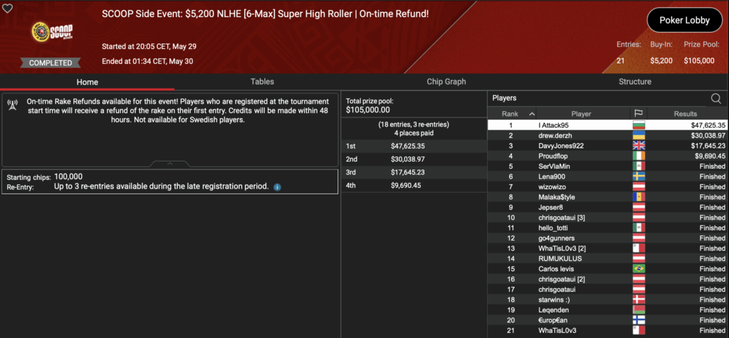 Ein mächtiges Side Event war das SCOOP Side Event: $5.200 NLHE Super High Roller mit einem Rake-Refund für diejenigen, die sich vor Start des Turniers anmeldeten. 21 Anmeldungen gab es insgesamt und vier Spieler waren im Geld. Der Großteil des $105.000 Preispools ging an den Bulgaren ‚I Attack95‚. Dieser konnte $47.625 mit nach Hause nehmen.