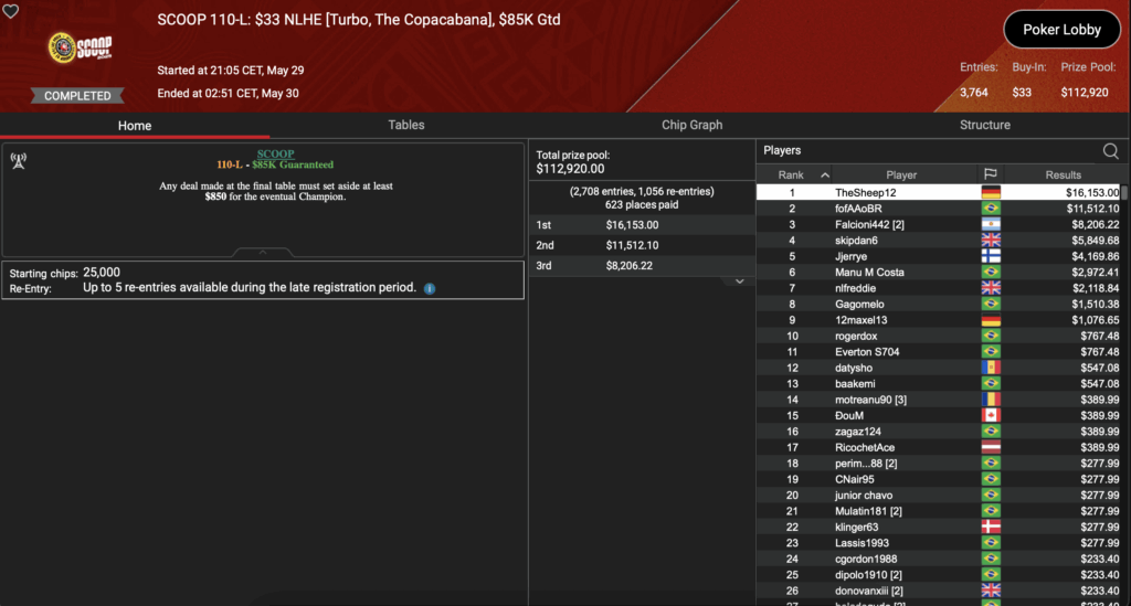 Im SCOOP 110-L: $33 NLHE The Copacabana ($85k GTD) haben wir einen deutschen Sieger zu vermelden. 3.764 mal wurde das Buy-in bezahlt und so kam es zu einem $112.920 Preispool. Auch wenn hier wieder alles voller brasilianischer Flaggen war, war es der deutsche Spieler ‚TheSheep12‚, der sich nach oben in der Rangliste kämpfen konnte und erhielt für den Sieg $16.153.