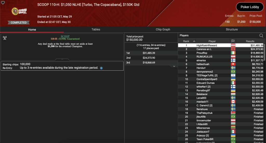 Und auch in der teuren Variante des Turniers, dem SCOOP 110-H: $1.050 NLHE The Copacabana ($150k GTD), hatten wir einen DACH-Sieger! Mit 150 Entries wurde die Garantie exakt erfüllt und am Ende war es der Österreicher ‚HighRiskHReward‚, der den Top-Preis von $31.485 für sich beanspruchen konnte.