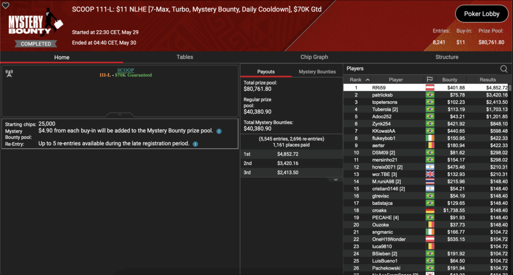 Im SCOOP 111-L: $11 Mystery Bounty ($70k GTD) ließ der österreichische Spieler ‚RRi59‚ einen Haufen brasilianischer Flaggen hinter sich und entscheid das Turnier für sich. 8.241 Entries gab es für dieses Turnier und somit einen $80.761 Preispool. Der Top-Preis lag bei $4.852 plus Bounties.