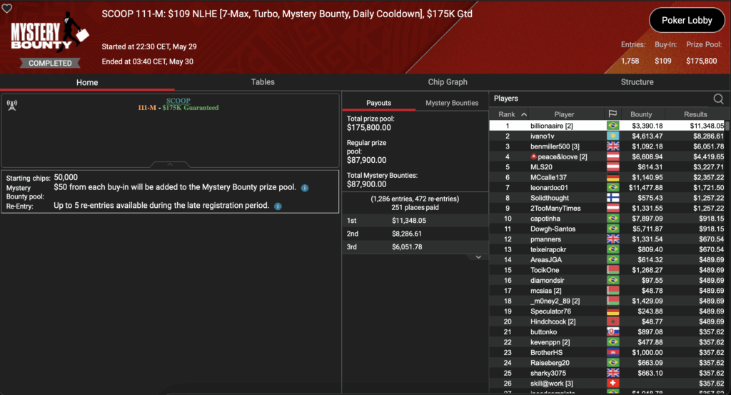 Trotz vier DACH-Spielern in den Top 10 bei Event SCOOP 111-M: $109 Mystery Bounty ($175k GTD) war es am Ende ein Brasilianer, der den Sieg einfahren konnte. 1.758 Spieler hatten einen $175.800 Preispool geschaffen und ‚billionaaire“ konnte $11.348 plus $3.390 an Bounties für sich beanspruchen.