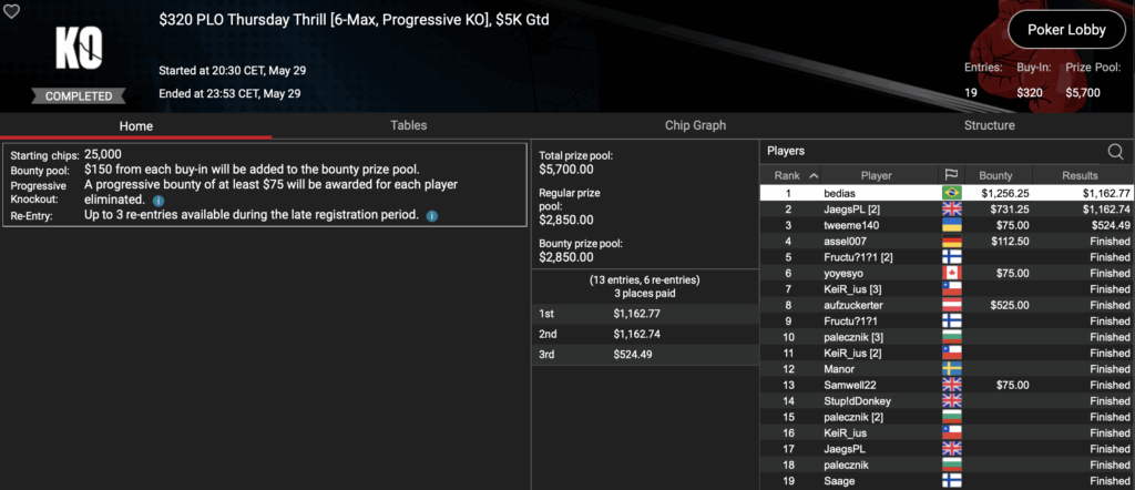 Zu guter Letzt schauen wir uns das $320 PLO Thursday Thrill PKO ($5k GTD) an. Hier gab es 13 4-Karten-Liebhaber, die das Buy-in insgesamt 19 mal bezahlten. Somit kam es zu einem Preispool von $5.700, der auf die Top drei Spieler verteilt wurde. Ganz oben stand am Ende wieder eine brasilianische Flagge. ‚bedias‚ kassierte für den Sieg $1.162 plus $1.256.