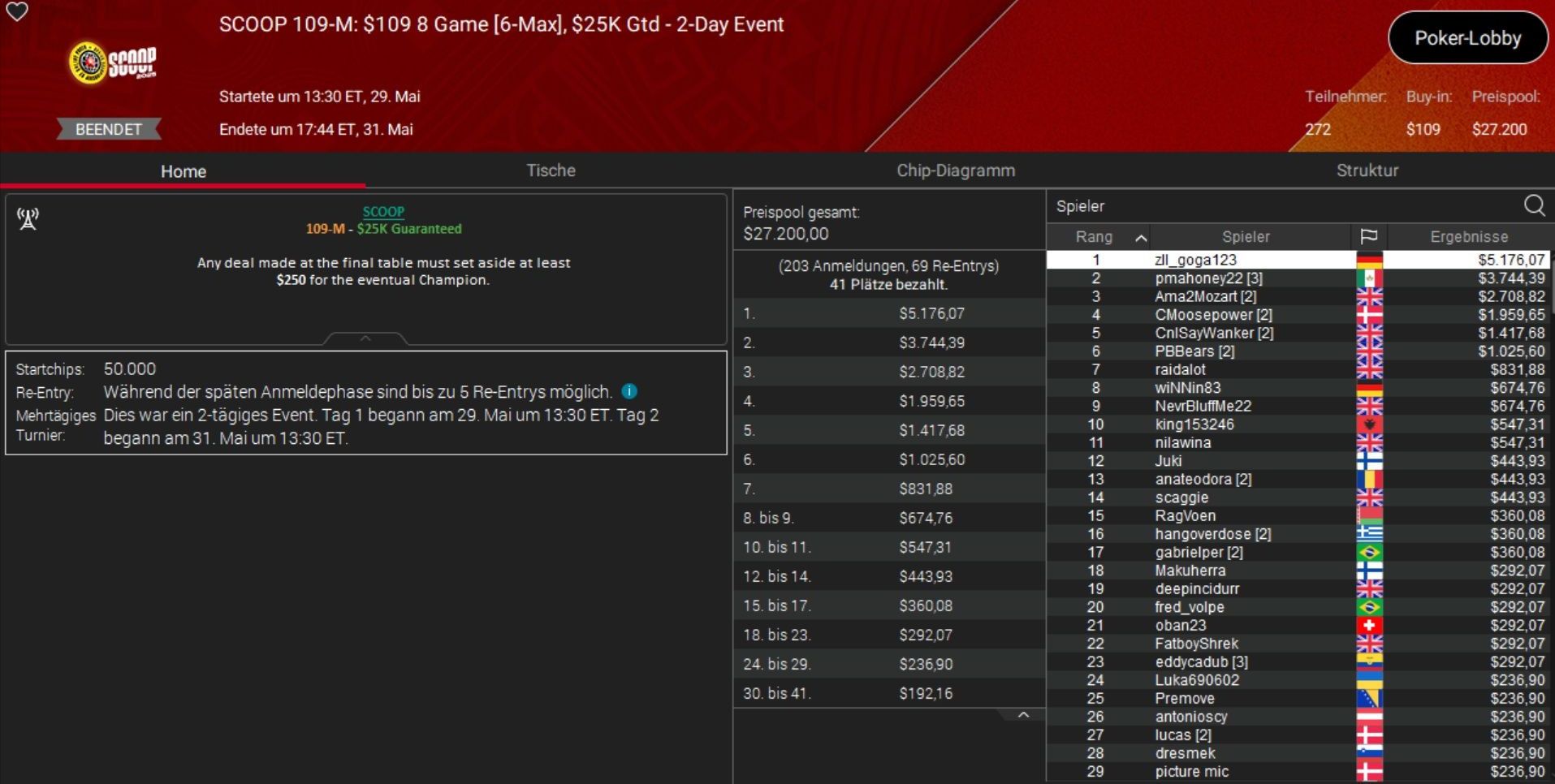 Für den dritten DACH-Sieg sorgte „zll_goga123“ aus Deutschland, der beim $109 8-Game (Event 109-M) 271 Spieler in die Schranken verwies.