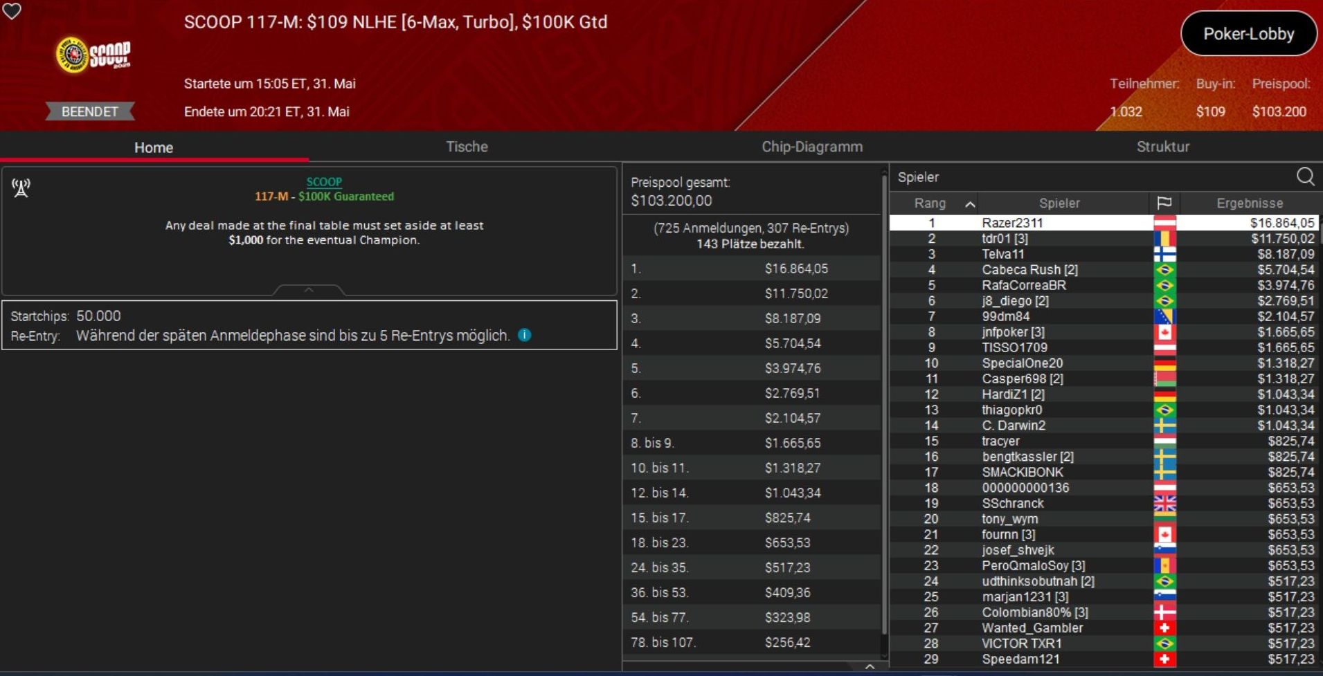 Mann des Tages aus DACH-Sicht war gestern Daniel „razer2311“ Rezaei, der sich bei Event 117-M, einem $109 NLH Turbo, Gold holte und knapp $17.000 Preisgeld einfuhr.