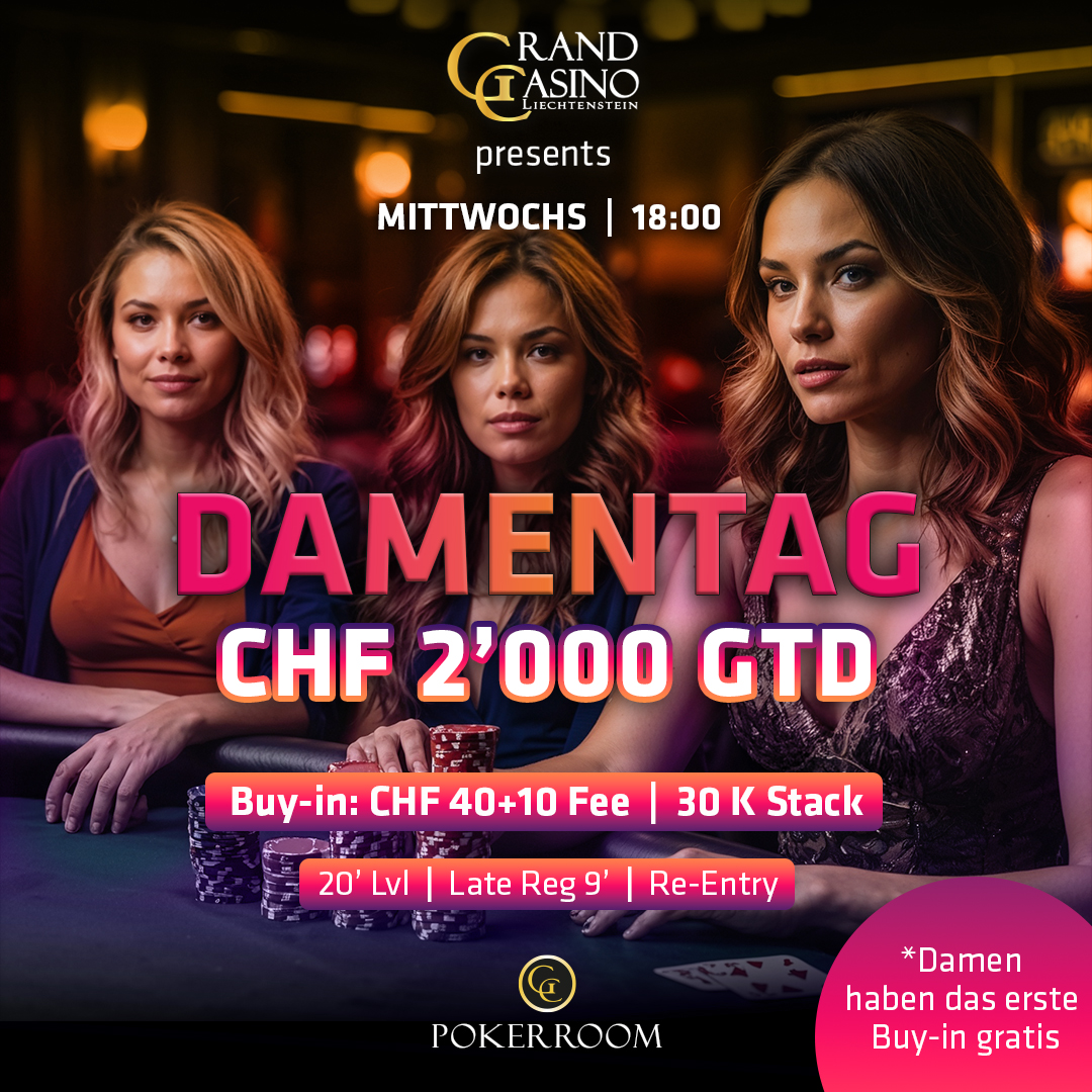 Am Dienstag gibt es im GC Pokerroom ab 18:00 Uhr das CHF 40+10 „Damentag“ Event. Damen haben das erste Buy-In frei. Hier geht es mit 30.000 in Chips los und jeder Level dauert 20 Minuten. Der Re-Entry ist möglich und die Late-Registration ist für neun Levels geöffnet.