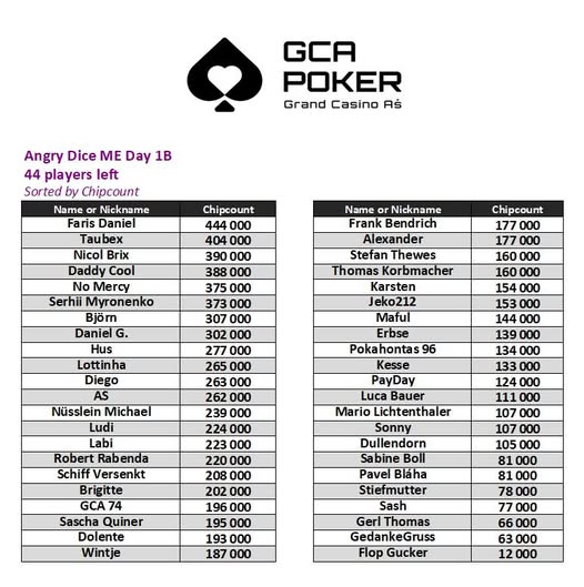 Im Grand Casino As (GCA) wurde gestern der Tag 1B des Angry Dice Poker Festival €120 Main Event ausgetragen. Daneben gab es noch zwei Side Events mit dem €80 Angry Dice Special (€10.000 GTD) und dem €60 Angry Dice Bounty (€2.000 GTD).