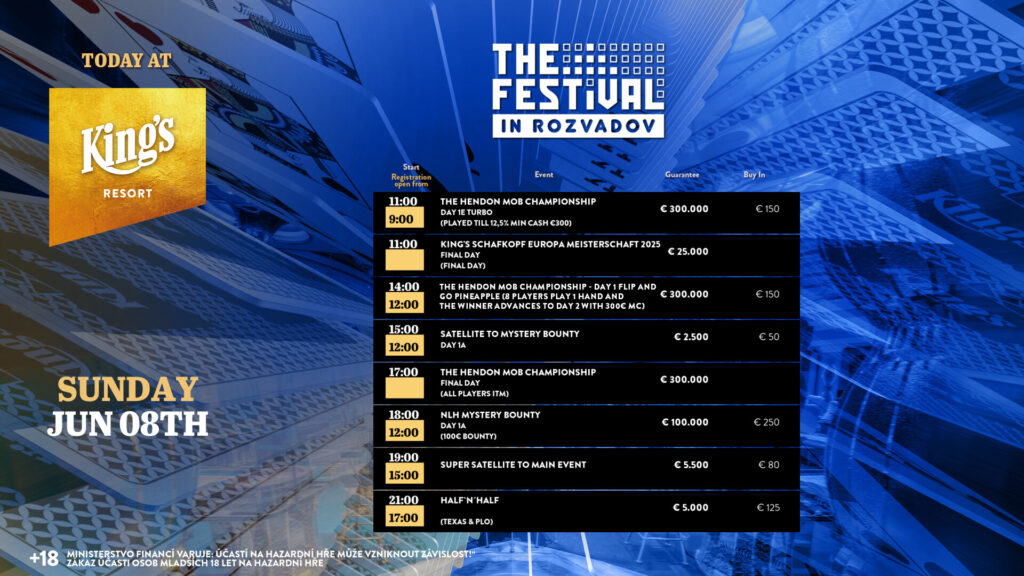 Im King’s Resort Rozvadov ging es gestern weiter mit „The Festival“ mit zwei Starttagen für das €150 The Hendon Mob Championship Event (€300.000 GTD), dem €250 PLO Masters (€10.000 GTD) und dem €125 Texas Saturday Knockout Madness (€10.000 GTD). Im King’s Casino Prag stand das €80 King’s Prague Saturday Monsterstack (€10.000 GTD) auf dem Programm.