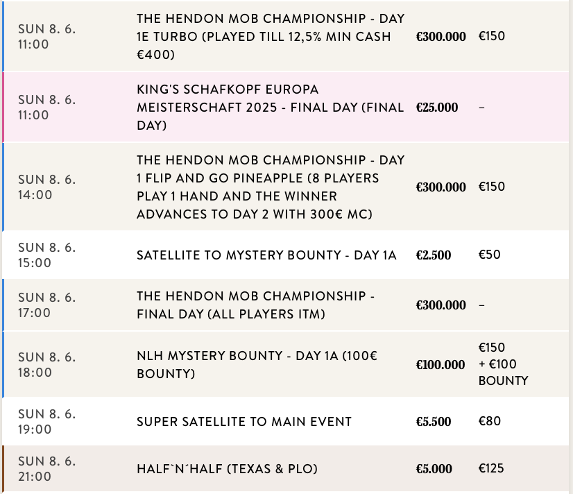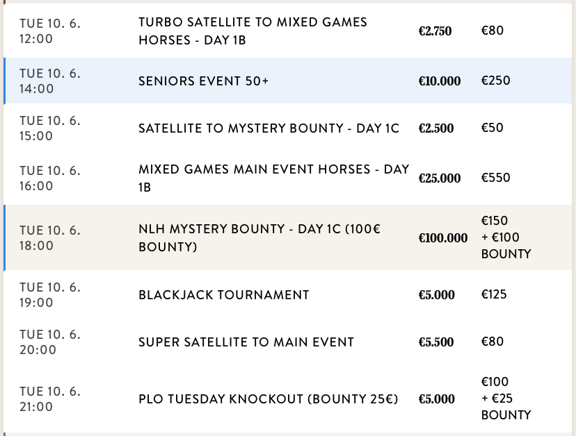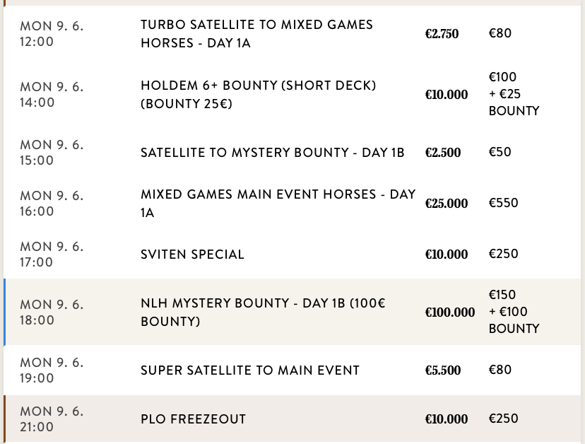 Und hier das Turnierprogramm vom King’s Casino Prag: