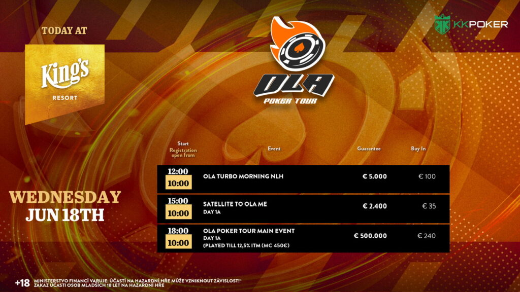 Heute geht es im King’s Resort Rozvadov weiter mit den ersten Events des Ola Poker Tour Festivals. Als erstes gibt es um 12:00 Uhr das €100 Ola Turbo Morning NLH (€5.000 GTD). Um 18:00 Uhr gibt es dann den ersten Starttag 1A für das €240 Ola Poker Tour Main Event (€500.000 GTD). Wer es versuchen möchte, sich günstiger für das Event zu qualifizieren, kann dies um 15:00 Uhr in einem €35 Satellite versuchen.
