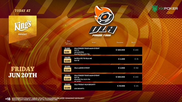 Im King’s Resort Rozvadov wurde gestern der zweite Flight im Ola Poker Tour Festival Main Event gespielt – zudem wurde das Ola Turbo Morning Bounty gezockt. In Prag wurde ein weiterer Pokerman-Flight gespielt!