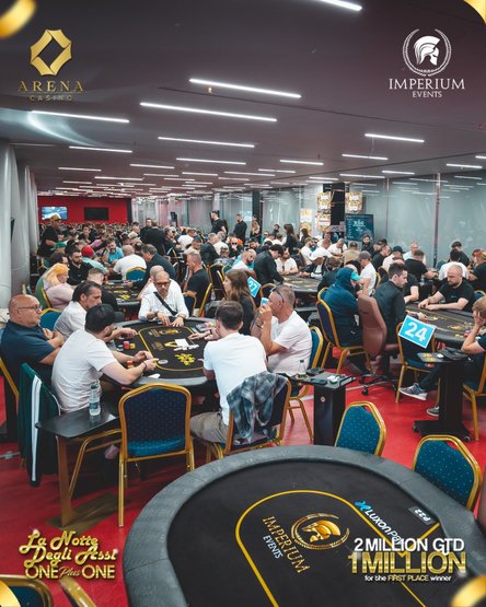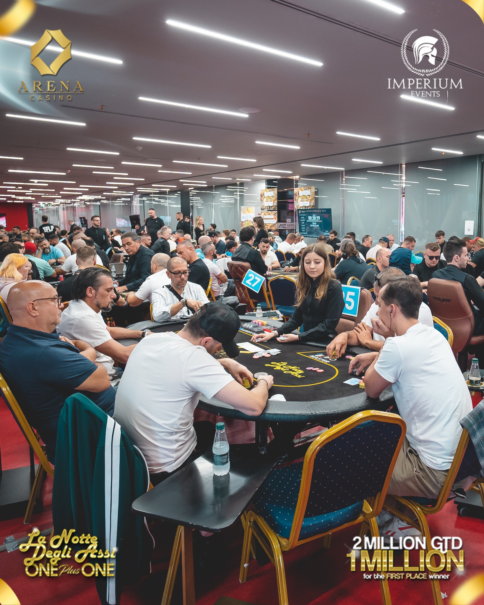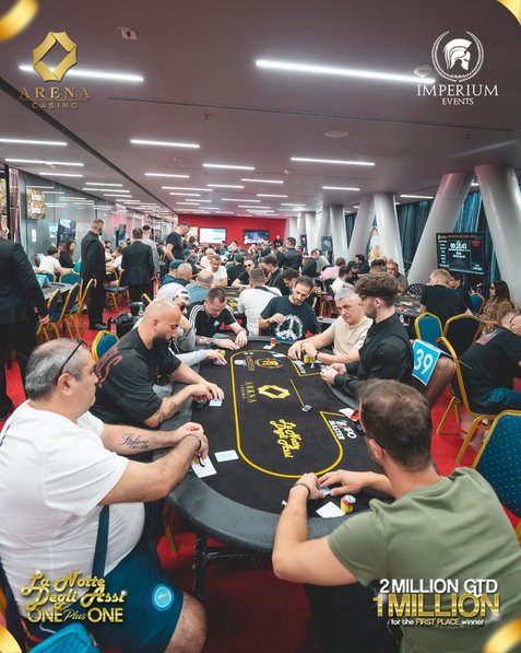 Eins plus eins ist die einfache Rechnung beim Main Event der La Notte Degli Assi in Albanien. Das Ergebnis sind zwei Millionen Euro Garantie, eine für den Sieg und eine für alle anderen ITM-Finisher. Gleich 8-mal erhält man an Tag-1-Flights die Chance, sich für €1.000+€150 für Tag 2 des 4-Day-Events zu qualifizieren. An den Starttagen 1A und 1B sogar zum Sonderpreis von nur €900+€100! An allen Starttagen wird mit 50.000 Chips begonnen, die Blindlevel sind 40 Minuten lang (im Speed Flight 20) und die Late Registration ist 11 Level lang geöffnet. An Tag 2 werden die Level auf 60 Minuten, ab Tag 3 auf 75 Minuten verlängert. Der Final Table am 4. und damit letzten Tag wird dann am TV-Table ausgetragen und im Livestream überall zu sehen sein.