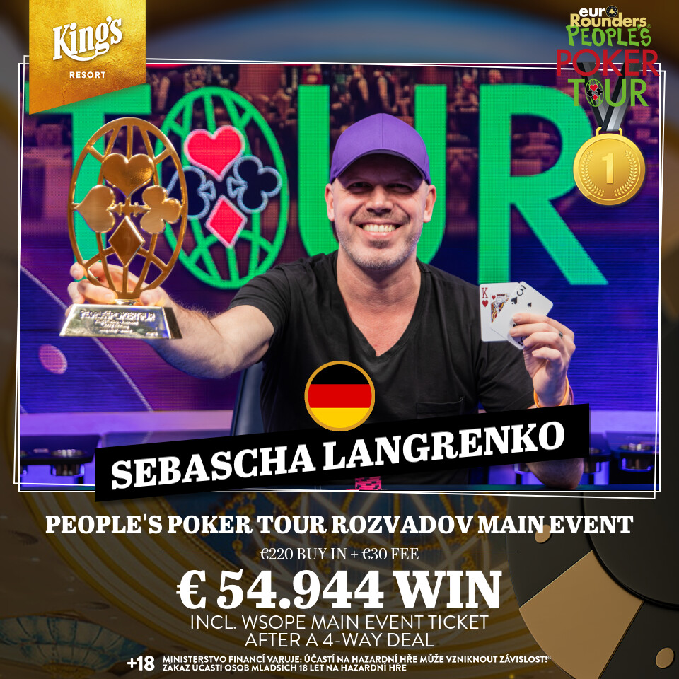 Bei der letzten Ausgabe der PPTour im Pokerroom King’s kamen 1.922 (1.425+497) Entrys zusammen, die am Ende um €475.000 Preisgeld spielen sollten. Am Finaltag einigte sich ein Quartett auf eine Teilung, an dessen Kopf Sebastian „Sebascha Langrenko“ Langrock den größten Teil in Höhe von €54.944 samt People’s Poker Tour Trophy erhielt.