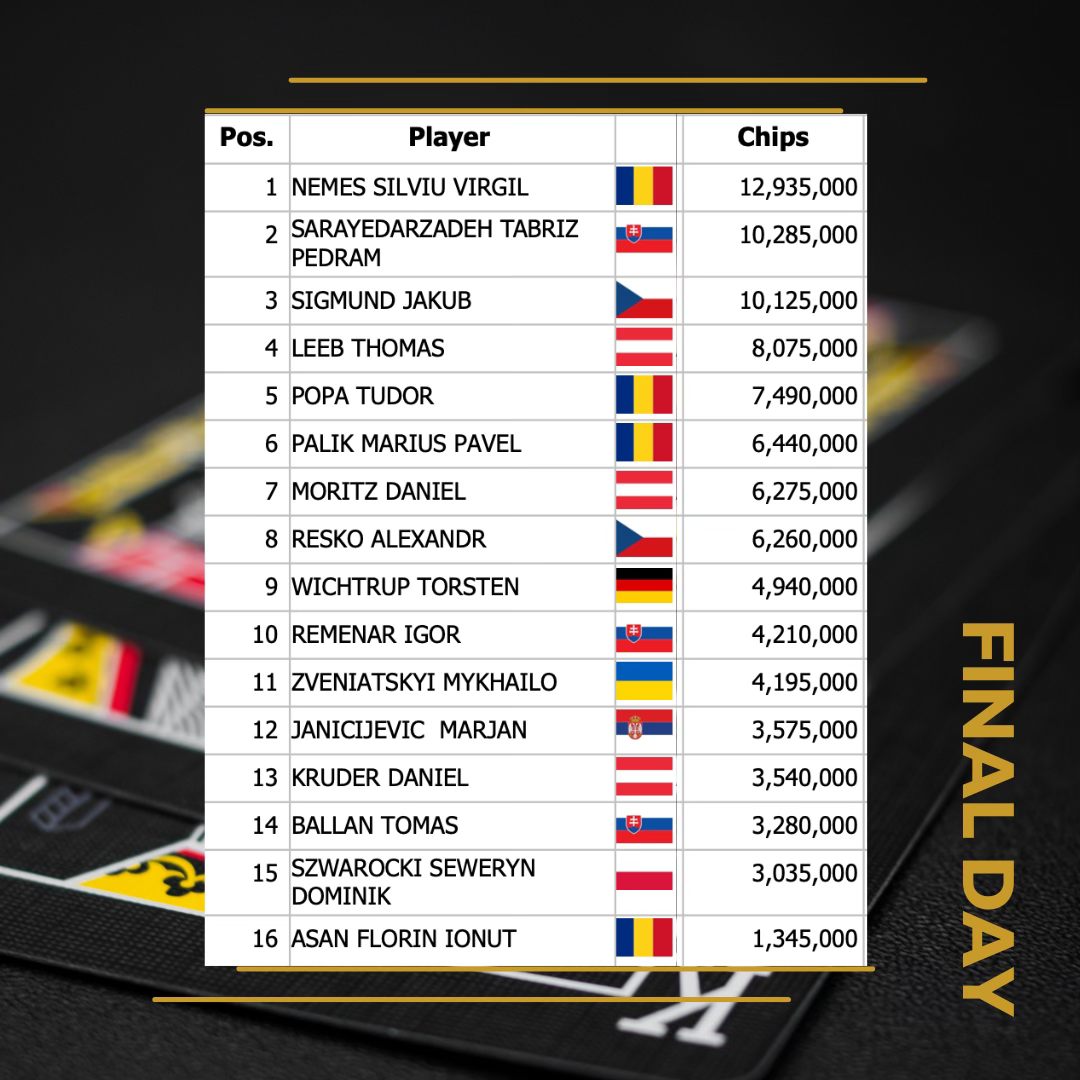 Dicht gefolgt von Pedram Sarayedarzadeh aus der Slowakei, der mit 10,28 Mio. Chips in zweiter Position sitzt.