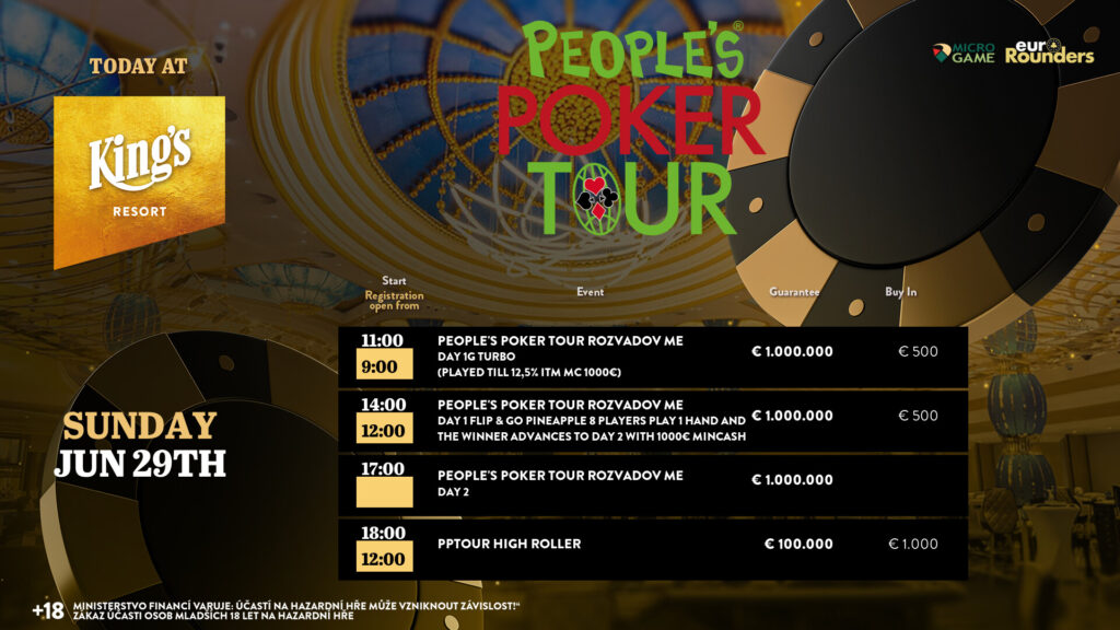 Die People’s Poker Tour (PPTour) powered by MicroGame und euroRounders ist in vollem Gange. Neben den €1.000.000 gtd. PPTour Main Event Flights 1E und 1F fand auch das PPTour Pot-Limit Omaha Side Event statt, das einen deutschen Sieger fand. Daneben wurden das Saturday Night Bounty im King’s Resort Rozvadov und das Saturday Monster Stack im King’s Casino Prague entschieden!